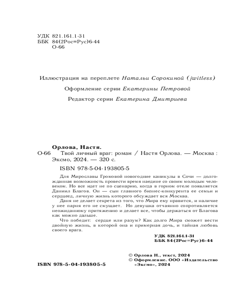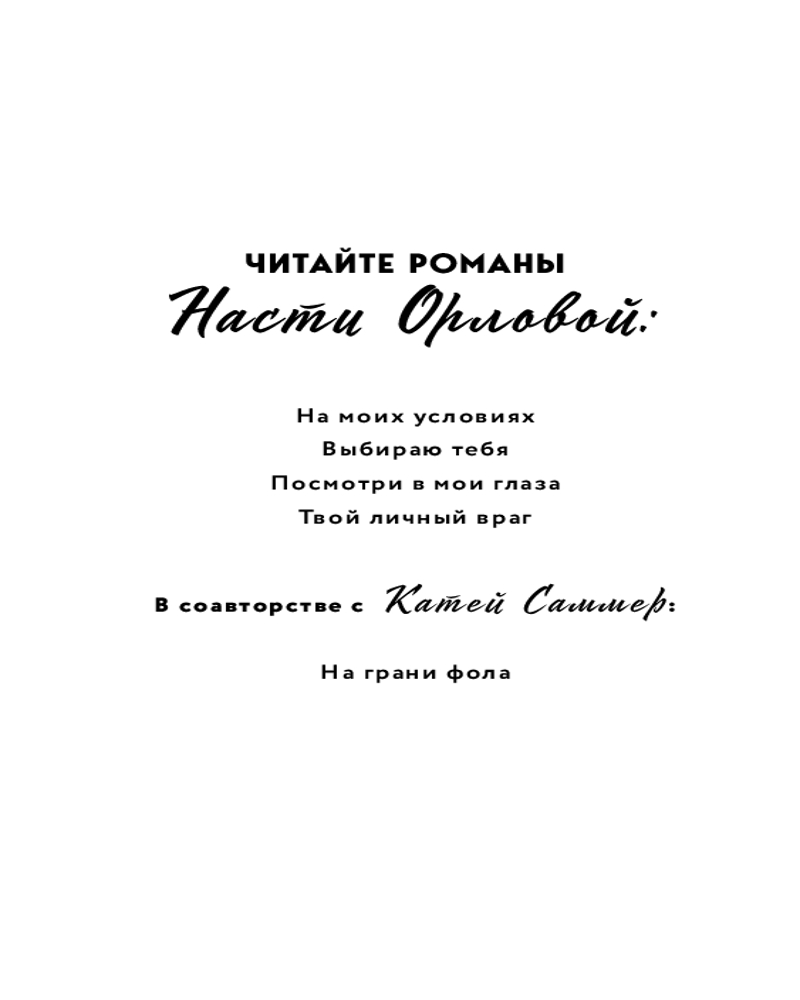 💳 Оплатить за товар можно при получении 🇰🇿 Есть бесплатная доставка по Казахстану от 1 дня 🎁 Копите бонусы с каждой покупки Серия: Всегда побеждает любовь. Проза Насти Орловой Романтические истории Насти Орловой такие чувственные и увлекательные, что задевают за живое, заставляя сопереживать героям и радоваться за них, как за своих давних знакомых. В каждом романе вас ждет дополнительная глава и опус от автора! |