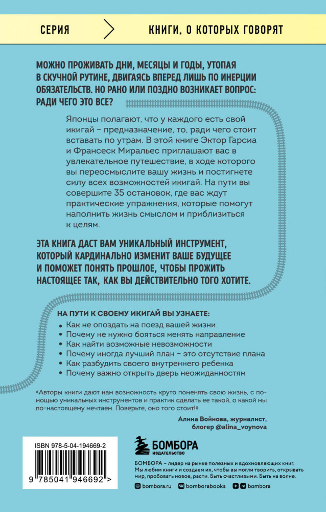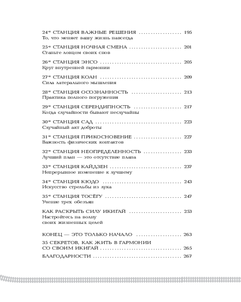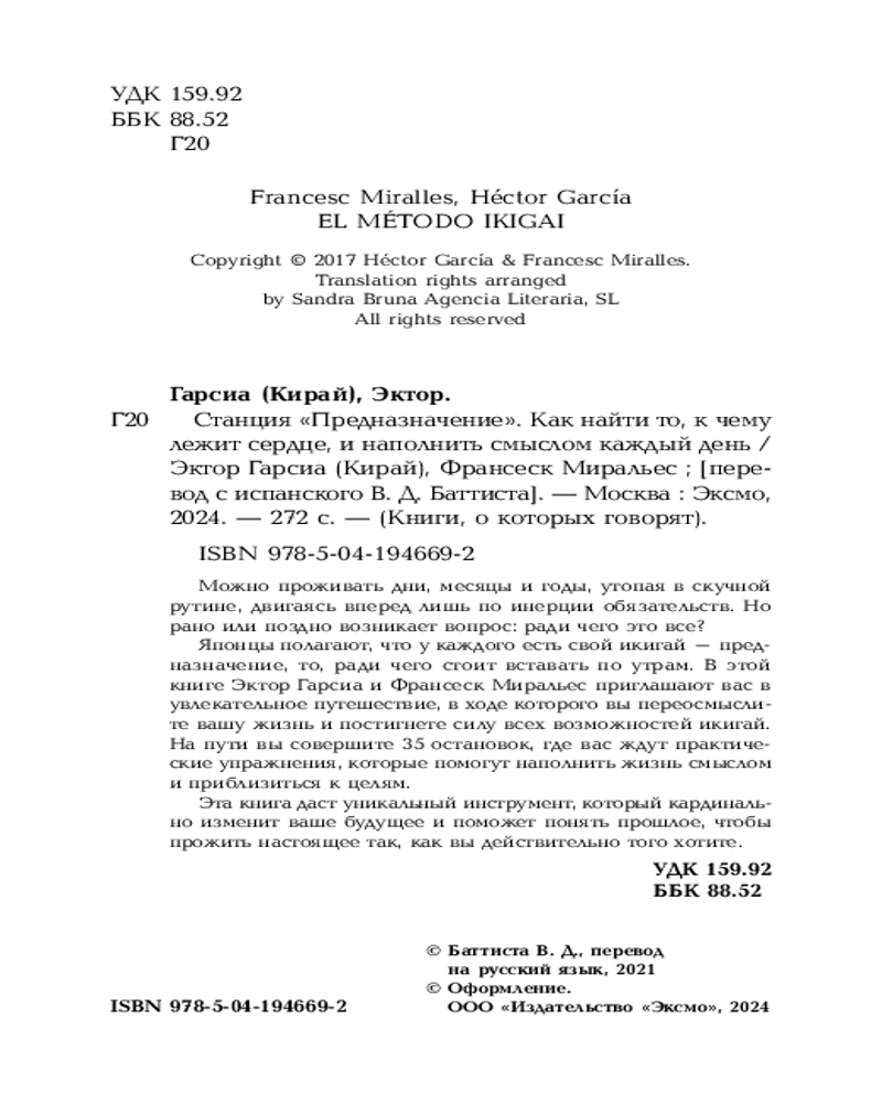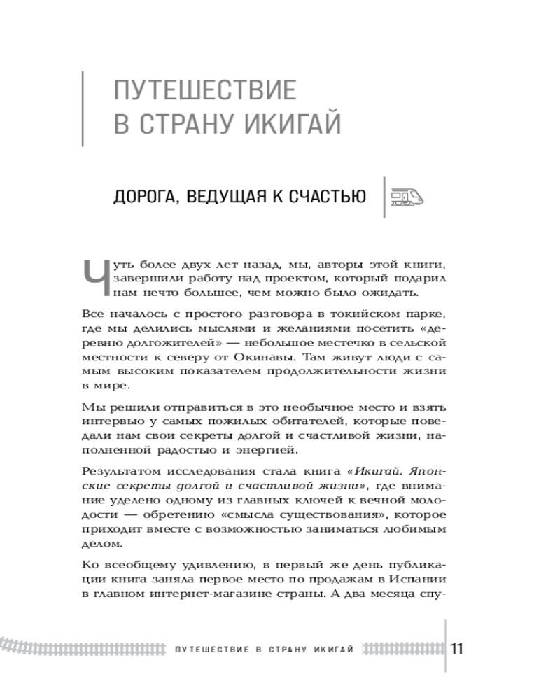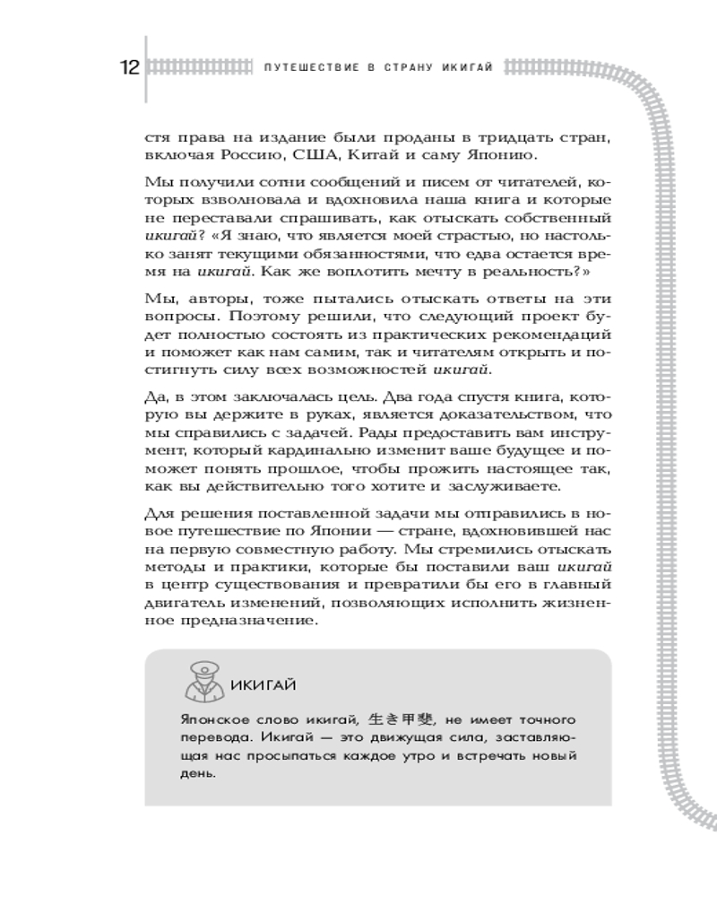 Можно проживать дни, месяцы и годы, утопая в скучной рутине, двигаясь вперед лишь по инерции обязательств. Но рано или поздно возникает вопрос: ради чего это все? Японцы полагают, что у каждого есть свой икигай — предназначение, то, ради чего стоит вставать по утрам. В этой книге Эктор Гарсиа и Франсеск Миральес приглашают вас в увлекательное путешествие, в ходе которого вы переосмыслите вашу жизнь и постигнете силу всех возможностей икигай. На пути вы совершите 35 остановок, где вас ждут практические упражнения, которые помогут наполнить жизнь смыслом и приблизиться к целям. Эта книга даст вам уникальный инструмент, который кардинально изменит ваше будущее и поможет понять прошлое, чтобы прожить настоящее так, как вы действительно того хотите.