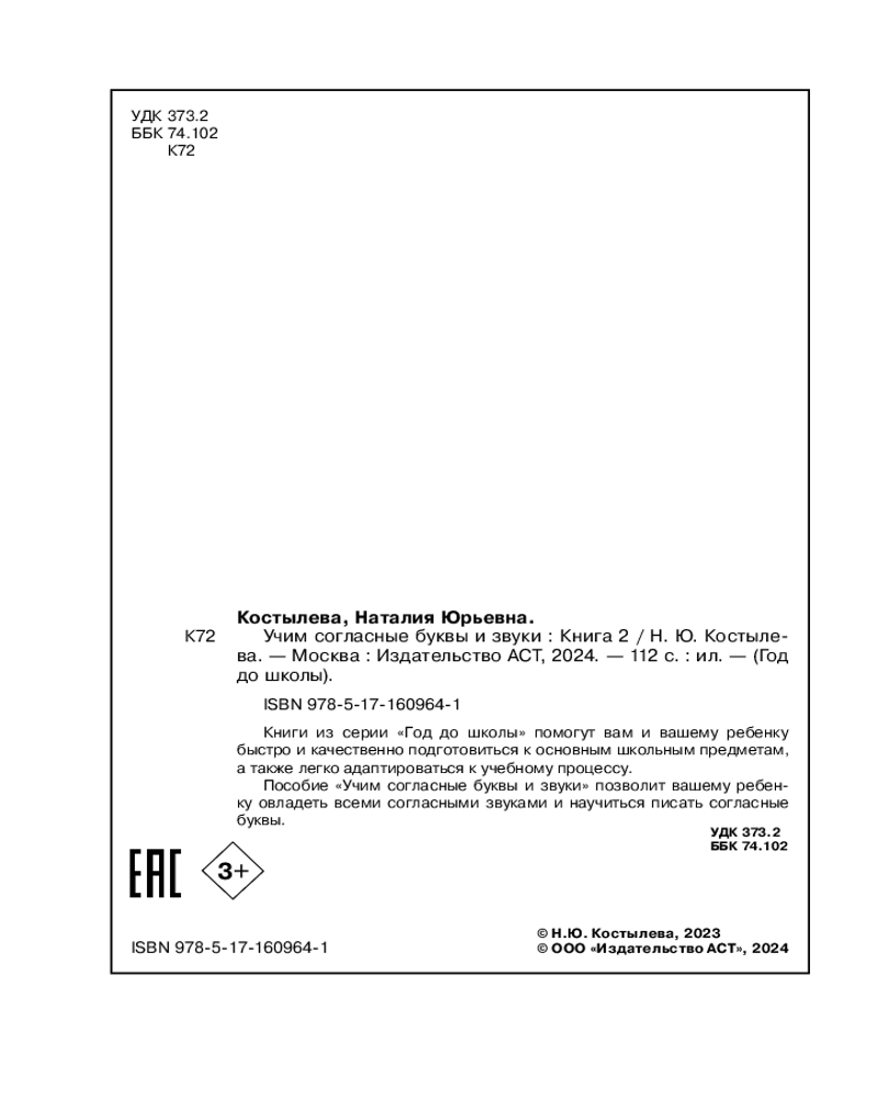 💳 Оплатить за товар можно при получении 🇰🇿 Есть бесплатная доставка по Казахстану от 1 дня 🎁 Копите бонусы с каждой покупки Серия: Год до школы Книги из серии «Год до школы» помогут вам и вашему ребенку быстро и качественно подготовиться к основным школьным предметам, а также легко адаптироваться к учебному процессу. Пособие «Учим согласные буквы и звуки» позволит вашему ребенку овладеть всеми согласными звуками и научиться писать согласные буквы. |