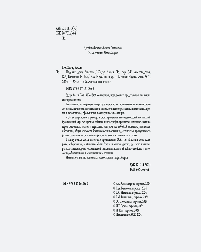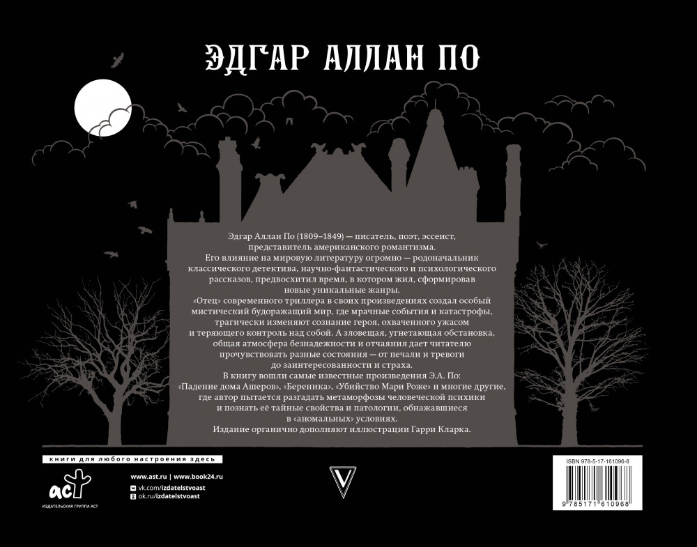 💳 Оплатить за товар можно при получении 🇰🇿 Есть бесплатная доставка по Казахстану от 1 дня 🎁 Копите бонусы с каждой покупки Серия: Коллекционная книга Эдгар Аллан По (1809–1849) — писатель, поэт, эссеист, представитель американского романтизма. Его влияние на мировую литературу огромно — родоначальник классического детектива, научно-фантастического и психологического рассказов, предвосхитил время, в котором жил, сформировав новые уникальные жанры. |