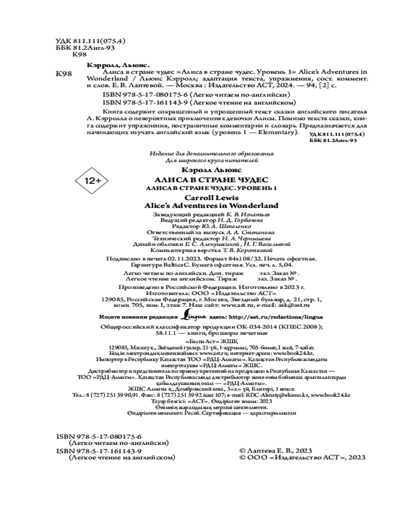 В данный момент этот товар отсутствует в продаже. Возможно, у нас найдется аналогичный или похожий товар здесь. Серия: Легкое чтение на английском Чарльз Лютвидж Доджсон, более известный как Льюис Кэрролл, — английский писатель, математик, философ, логик, диакон и фотограф. В юности поступил в колледж при Оксфордском университете, где позже стал читать лекции. Ещё во время обучения, писал стихотворения и короткие рассказы, которые подписывал псевдонимом «Льюис Кэрролл». Наиболее известными произведениями являются — «Алиса в Стране чудес» и «Алиса в Зазеркалье».