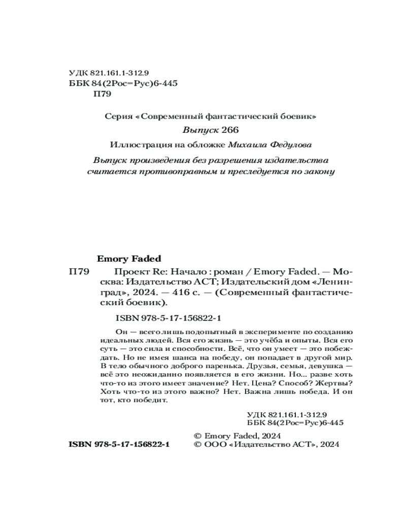 💳 Оплатить за товар можно при получении 🇰🇿 Есть бесплатная доставка по Казахстану от 1 дня 🎁 Копите бонусы с каждой покупки Серия: Современный фантастический боевик Он — всего лишь подопытный в эксперименте по созданию идеальных людей. Вся его жизнь — это учёба и опыты. Вся его суть — это сила и способности. Всё, что он умеет — это побеждать. Но не имея шанса на победу, он попадает в другой мир. В тело обычного доброго паренька. Друзья, семья, девушка — всё это неожиданно появляется в его жизни. Но... разве хоть что-то из этого имеет значение? Нет. Цена? Способ? Жертвы? Хоть что-то из этого важно? Нет. Важна лишь победа. И он тот, кто победит. |