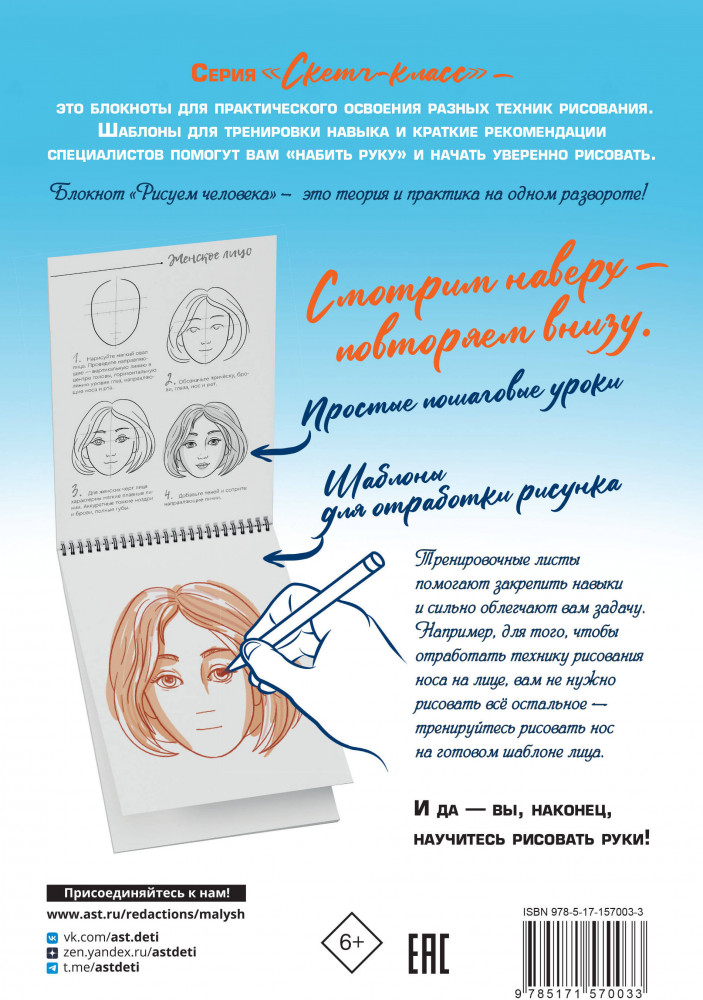 Серия: Скетч-класс. Рисуют взрослые и дети Серия «Скетч-класс» — это блокноты для практического освоения разных техник рисования. Шаблоны для тренировки навыка и краткие рекомендации специалистов помогут вам «набить руку» и начать уверенно рисовать. Блокнот «Рисуем человека» это практика на каждом развороте! Тренировочные листы помогают закрепить навыки и сильно облегчают вам задачу. Например, для того, чтобы отработать технику рисования носа на лице, вам не нужно рисовать все остальное — тренируйтесь рисовать нос на готовом шаблоне лица! И да — вы наконец научитесь рисовать руки! |