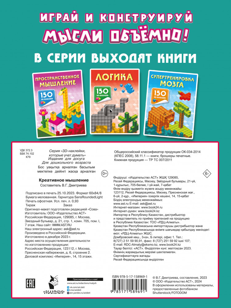 💳 Оплатить за товар можно при получении 🇰🇿 Есть бесплатная доставка по Казахстану от 1 дня 🎁 Копите бонусы с каждой покупки Серия: 3D наклейки, которые учат думать «Креативное мышление» — это развивающая книжка с 3D-наклейками для детей от 5 лет. 3D-стикеры — специальные «кирпичики», из которых нужно строить различные трёхмерные объекты. Заниматься по книжке не только интересно, но и очень полезно, ведь моделирование объёмных предметов стимулирует пространственное мышление, а игра с наклейками способствует развитию мелкой моторики. Для дошкольного возраста. |