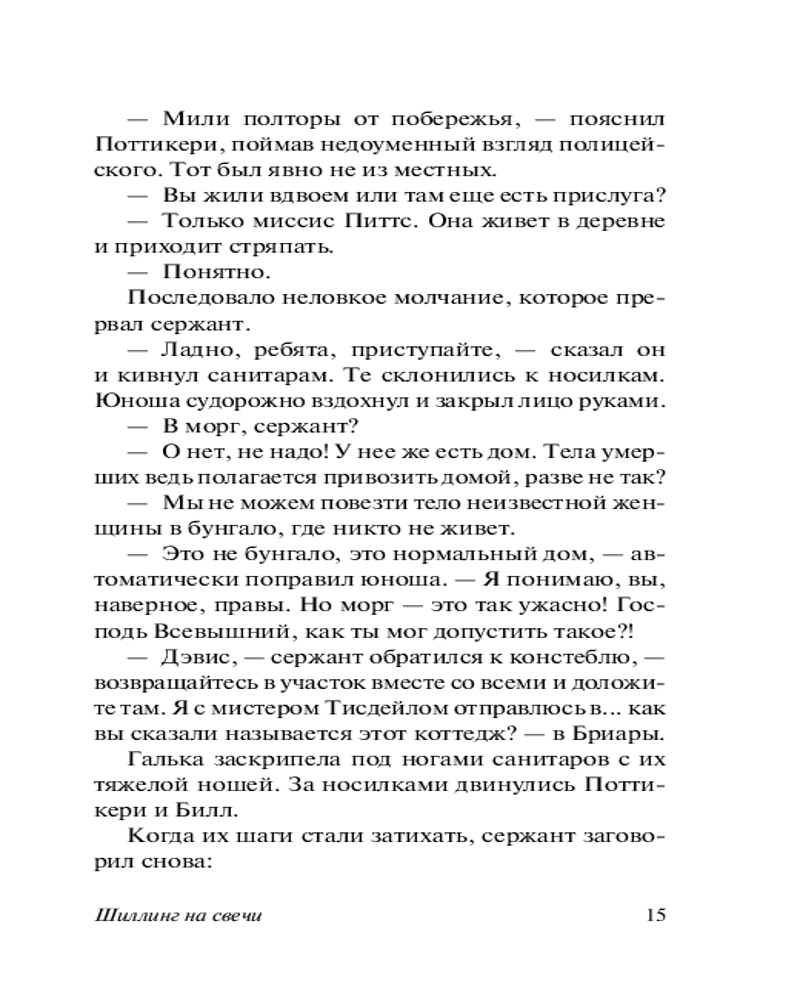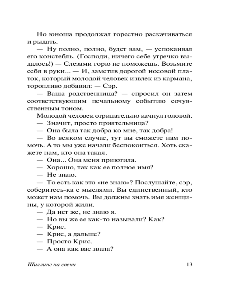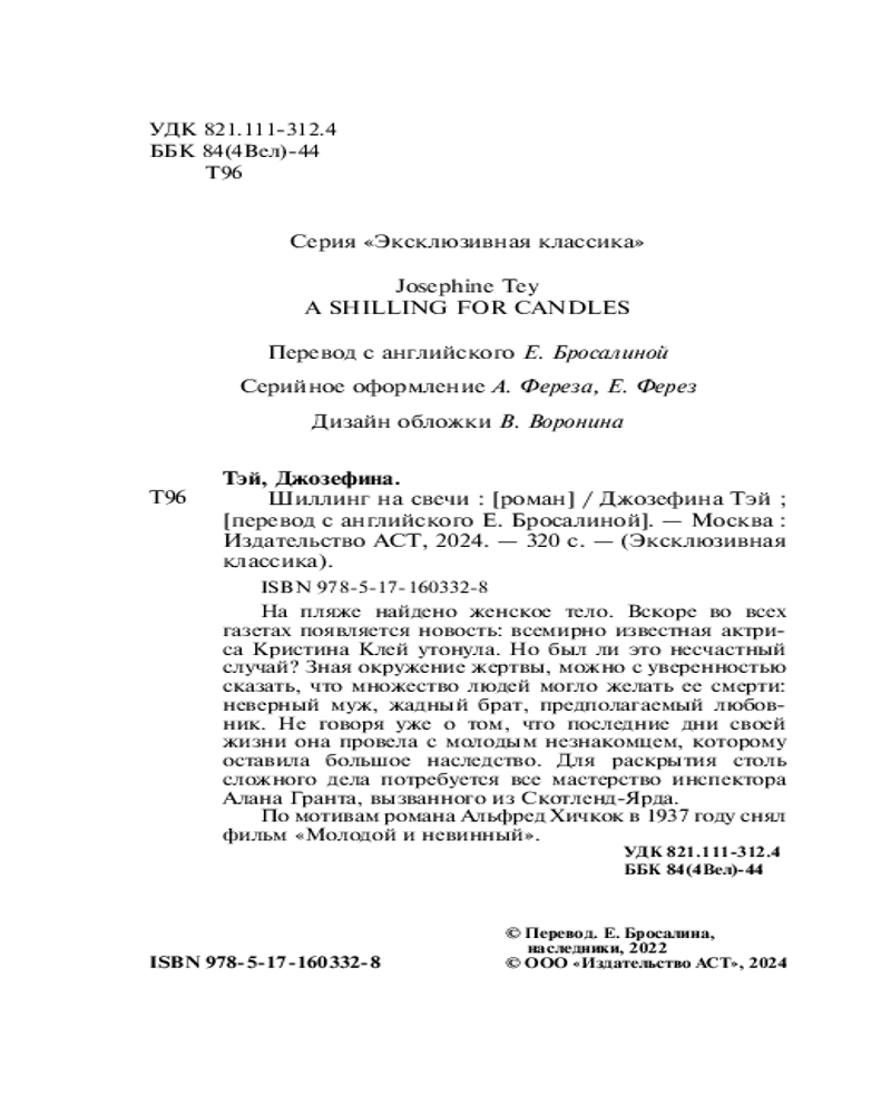 Шиллинг на свечиВ данный момент этот товар отсутствует в продаже. Возможно, у нас найдется аналогичный или похожий товар здесь. Серия: Эксклюзивная классика На пляже найдено женское тело. Вскоре во всех газетах появляется новость: всемирно известная актриса Кристина Клей утонула. Но был ли это несчастный случай? Зная окружение жертвы, можно с уверенностью сказать, что множество людей могло желать ее смерти: неверный муж, жадный брат, предполагаемый любовник. Не говоря уже о том, что последние дни своей жизни она провела с молодым незнакомцем, которому оставила большое наследство. Для раскрытия столь сложного дела потребуется все мастерство инспектора Алана Гранта, вызванного из Скотленд-Ярда. По мотивам романа Альфред Хичкок в 1937 году снял фильм «Молодой и невинный». |