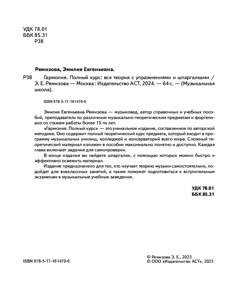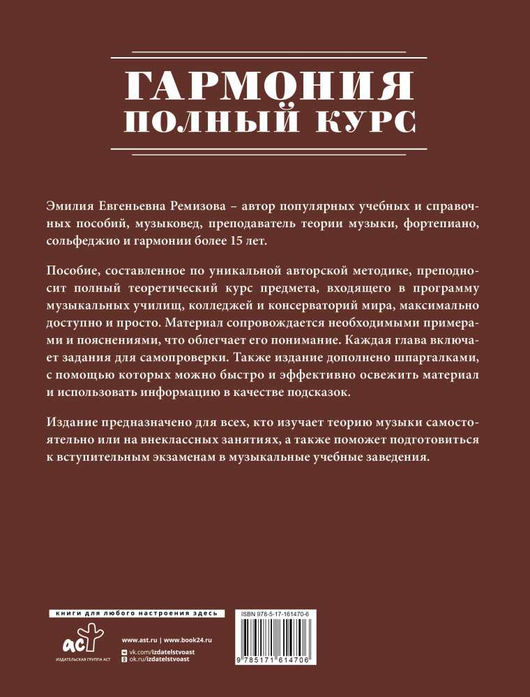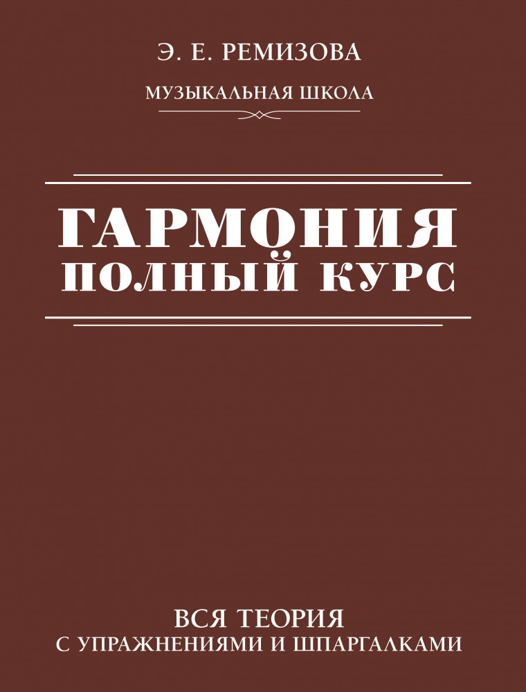 В данный момент этот товар отсутствует в продаже. Возможно, у нас найдется аналогичный или похожий товар здесь. Серия: Музыкальная школа Эмилия Евгеньевна Ремизова — музыковед, автор справочных и учебных пособий, преподаватель по различным музыкально-теоретическим предметам и фортепиано со стажем работы более 15-ти лет. «Гармония. Полный курс» — это уникальное издание, составленное по авторской методике. Оно содержит полный теоретический курс предмета, который входит в программу музыкальных училищ, колледжей и консерваторий всего мира. Сложный теоретический материал изложен в пособии максимально понятно и доступно. Каждая глава включает задания для самопроверки.