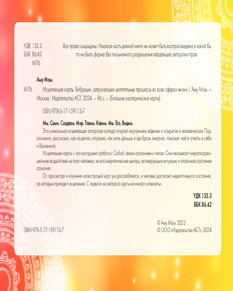 💳 Оплатить за товар можно при получении 🇰🇿 Есть бесплатная доставка по Казахстану от 1 дня 🎁 Копите бонусы с каждой покупки Серия: Большие эзотерические карты (коробка с картами + руководство) Эта уникальная исцеляющая авторская колода откроет внутреннее ви́дение и сокрытое в человеческом Подсознании; расскажет, как исцелить ситуацию, как жить дальше и где брать энергию, поможет найти ответы в себе и Вселенной. Исцеляющие карты — это инструмент работы с Собой, своим сознанием и телом. Они оказывают энергокоррекционное воздействие на тело человека, на его энергетические центры, активирующие интуицию и эталонное состояние сознания. |