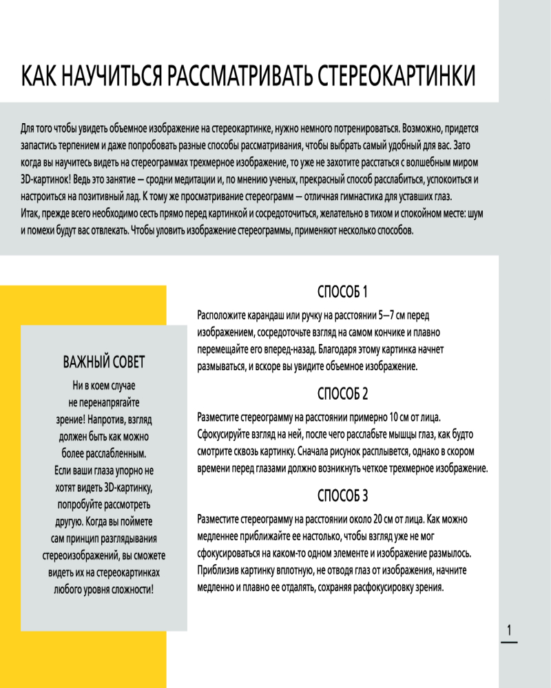 Магический глаз. 75 стереограмм. Тренировка и восстановление зренияВ данный момент этот товар отсутствует в продаже. Возможно, у нас найдется аналогичный или похожий товар здесь. Серия: Стереокартинки 3D Немного отвлечься от повседневной суеты и отдохнуть с пользой для здоровья поможет это издание. На его страницах размещено множество картинок, которые могут показаться совсем простыми и где-то даже однообразными. Но это только на первый взгляд, ведь на самом деле — это трехмерные картинки-загадки, на которых вам предстоит рассмотреть объемные изображения. Когда вы освоите принцип работы с книгой, перед вашим взором «материализуются» самые разные предметы — от животных и растений до сложных композиционных картин. |