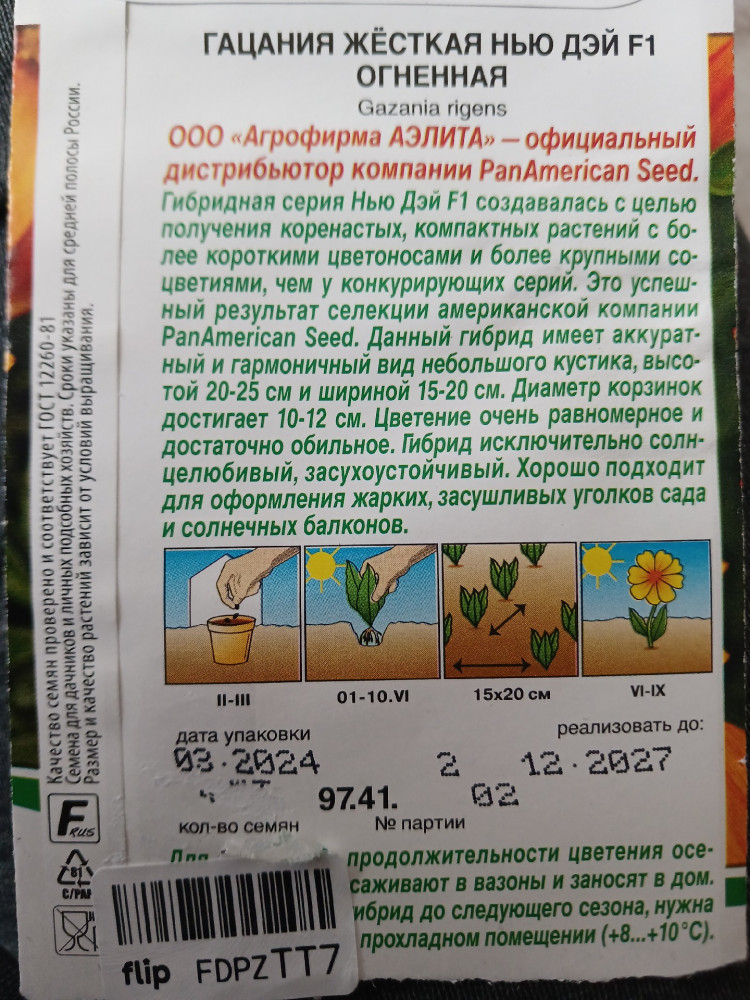 Аэлита Гацания жёсткая огненная-25% +6 низкая всхожесть партия некачественная