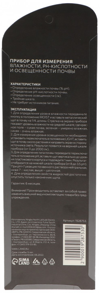 Luazon Home Прибор для измерения влажности, pH-кислотности и освещенности почвыВ данный момент этот товар отсутствует в продаже. Возможно, у нас найдется аналогичный или похожий товар здесь. Характеристики: |