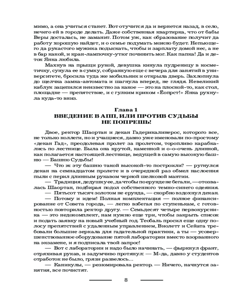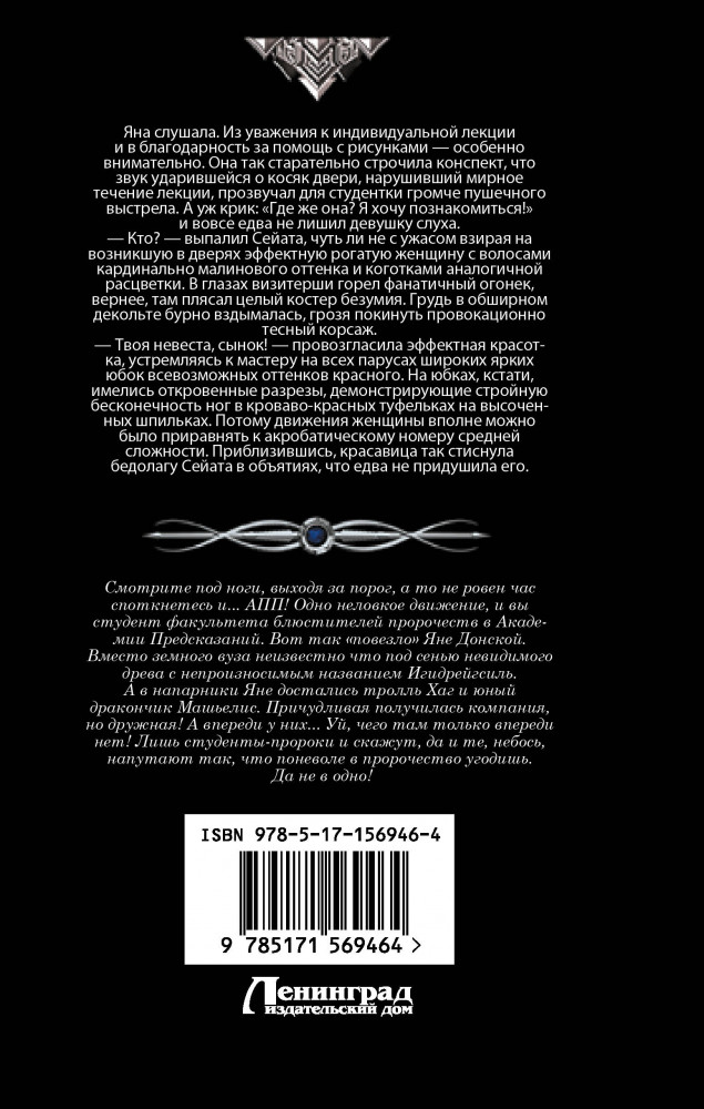 Академия пророчеств и предсказанийВ данный момент этот товар отсутствует в продаже. Возможно, у нас найдется аналогичный или похожий товар здесь. Серия: Коллекция. Другие миры Смотрите под ноги, выходя за порог, а то не ровен час споткнетесь и... АПП! Одно неловкое движение, и вы студент факультета блюстителей пророчеств в Академии Предсказаний. Вот так «повезло» Яне Донской. Вместо земного вуза неизвестно что под сенью невидимого древа с непроизносимым названием Игидрейгсиль. А в напарники Яне достались тролль Хаг и юный дракончик Машьелис. Причудливая получилась компания, но дружная! А впереди у них... Уй, чего там только впереди нет! Лишь студенты-пророки и скажут, да и те, небось, напутают так, что поневоле в пророчество угодишь. Да не в одно! |