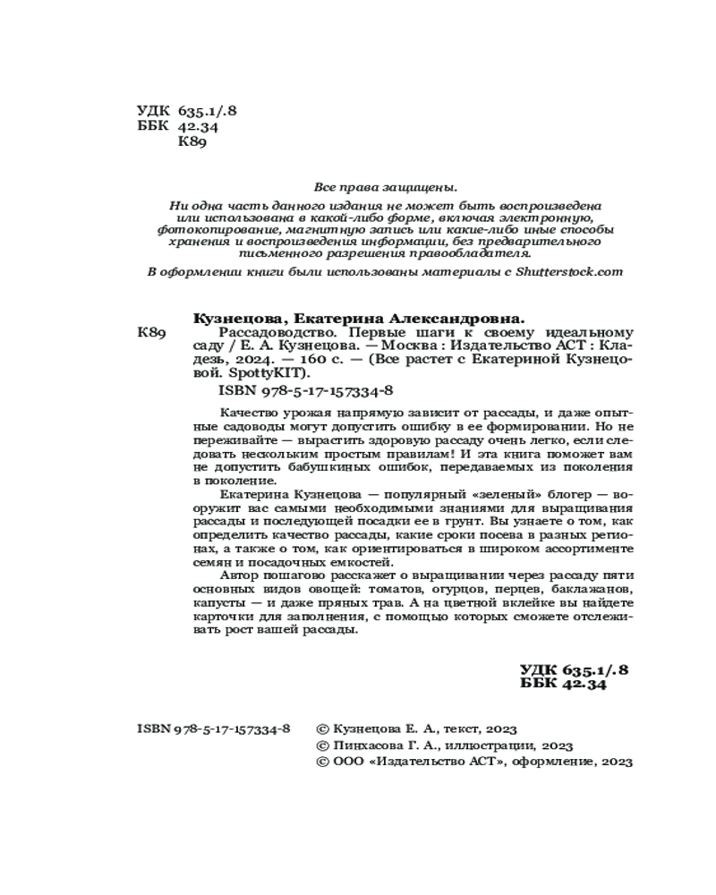 💳 Оплатить за товар можно при получении 🇰🇿 Есть бесплатная доставка по Казахстану от 1 дня 🎁 Копите бонусы с каждой покупки Серия: Все растет с Екатериной Кузнецовой. SpottyKIT Качество урожая напрямую зависит от рассады, и даже опытные садоводы могут допустить ошибку в ее формировании. Но не переживайте — вырастить здоровую рассаду очень легко, если следовать нескольким простым правилам! И эта книга поможет вам не допустить бабушкиных ошибок, передаваемых из поколения в поколение. |