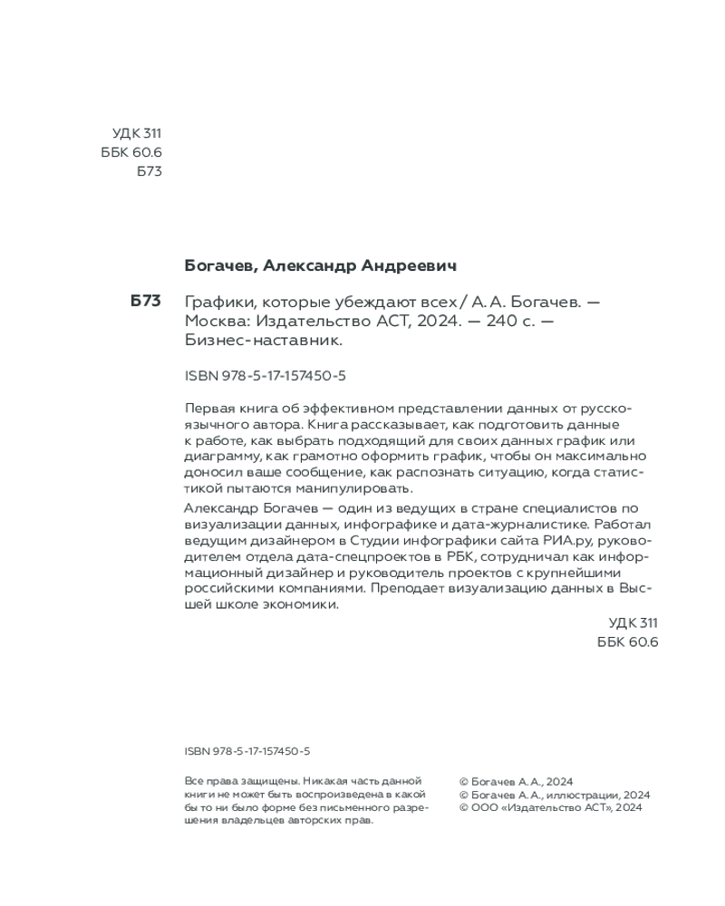 💳 Оплатить за товар можно при получении 🇰🇿 Есть бесплатная доставка по Казахстану от 1 дня 🎁 Копите бонусы с каждой покупки Серия: БизнесНаставник Первая книга об эффективном представлении данных от русскоязычного автора. Книга рассказывает, как подготовить данные к работе, как выбрать подходящий для своих данных график или диаграмму, как грамотно оформить график, чтобы он максимально доносил ваше сообщение, как распознать ситуацию, когда статистикой пытаются манипулировать. |