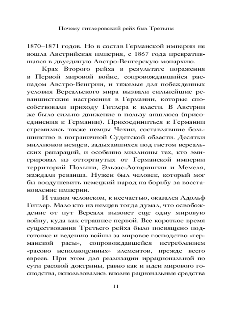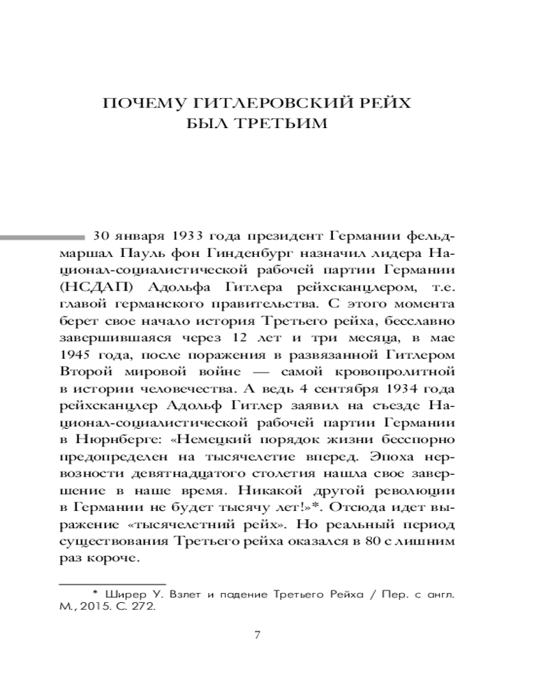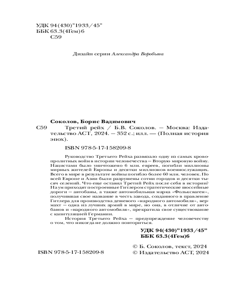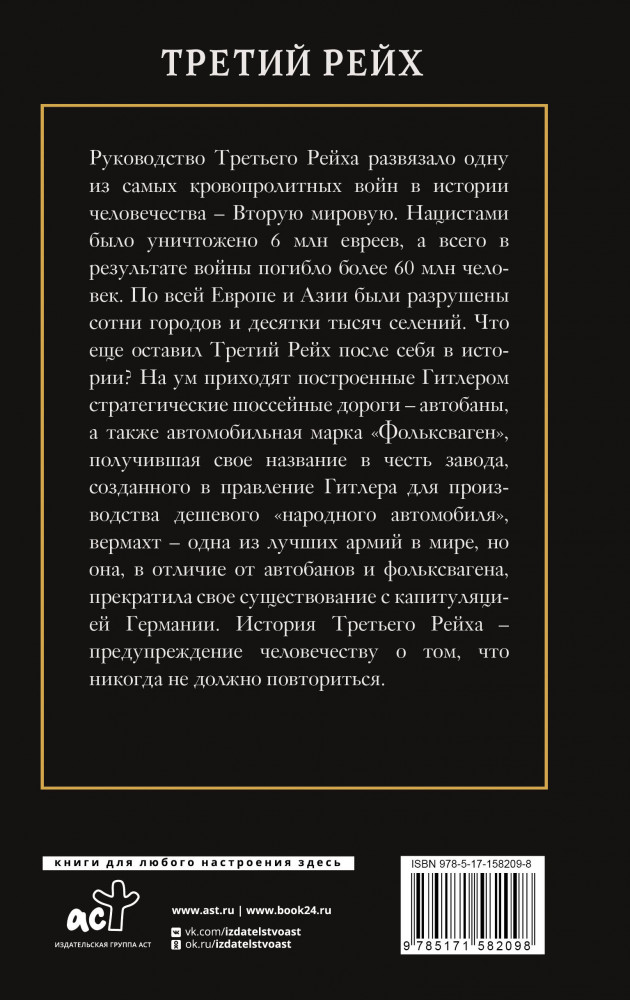 💳 Оплатить за товар можно при получении 🇰🇿 Есть бесплатная доставка по Казахстану от 1 дня 🎁 Копите бонусы с каждой покупки Серия: Полная история эпох Руководство Третьего рейха развязало одну из самых кровопролитных войн в истории человечества — Вторую мировую. Нацистами было уничтожено 6 млн. евреев, погибли миллионы мирных жителей Европы и десятки миллионов военнослужащих. Всего в мире в результате войны погибло более 60 млн. человек. По всей Европе и Азии были разрушены сотни городов и десятки тысяч селений. Что еще оставил Третий рейх после себя в истории? На ум приходят построенные Гитлером стратегические шоссейные дороги — автобаны, а также автомобильная марка «Фольксваген», получившая свое название в честь завода, созданного в правление Гитлера для производства дешевого «народного автомобиля», вермахт — одна из лучших армий в мире, но она, в отличие от автобанов и «народного автомобиля», прекратила свое существование с капитуляцией Германии. История Третьего рейха — предупреждение человечеству о том, что никогда не должно повториться. |