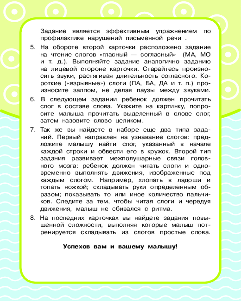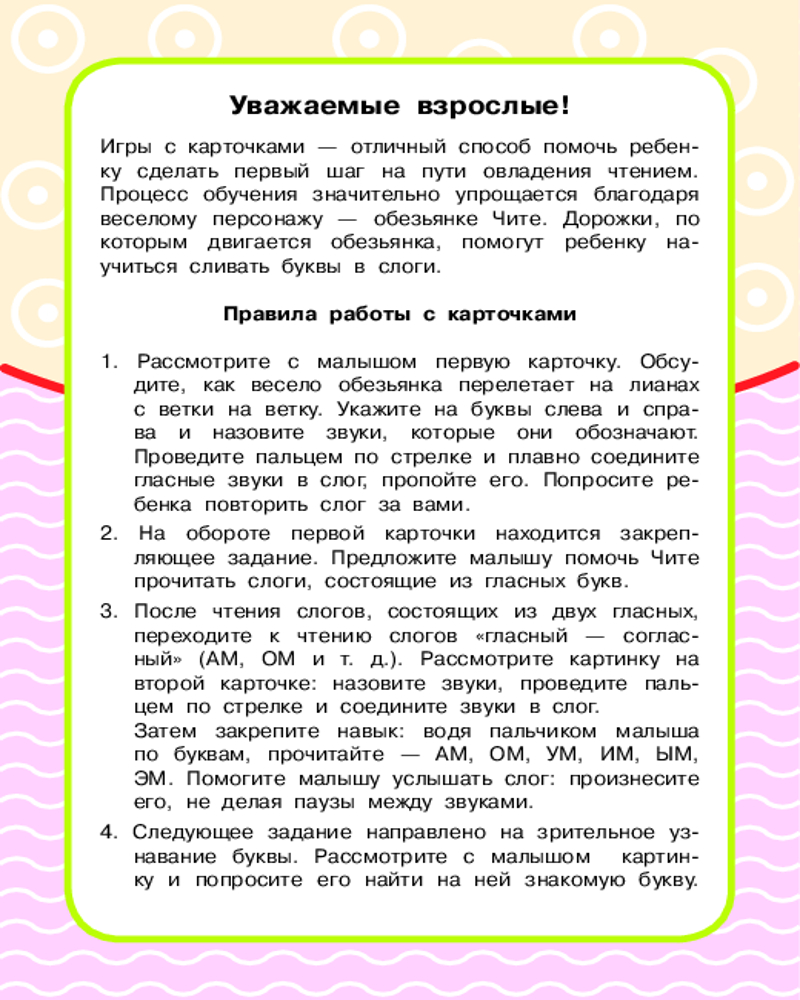 Складываем слогиВ данный момент этот товар отсутствует в продаже. Возможно, у нас найдется аналогичный или похожий товар здесь. Серия: Обучающие карточки. Легкий способ научить ребенка читать С помощью карточек можно легко научить читать любого ребенка, даже тех детей, которые только начинают говорить, или тех, которые испытывают проблемы с речью. А для малышей, которые скоро пойдут в школу, наши карточки — отличный способ не только научиться читать, но и отработать уже имеющиеся навыки. С помощью этого комплекта карточек ребенок легко пройдет самый сложный этап на пути овладения чтением: научится складывать из букв слоги. |