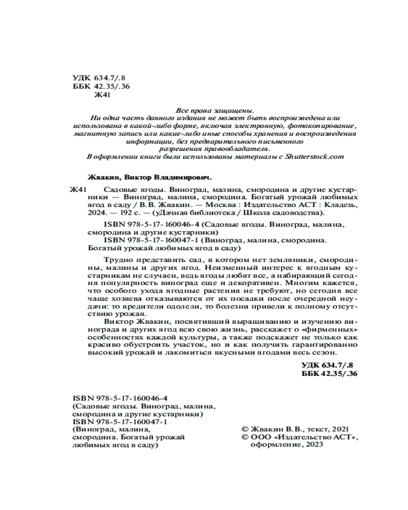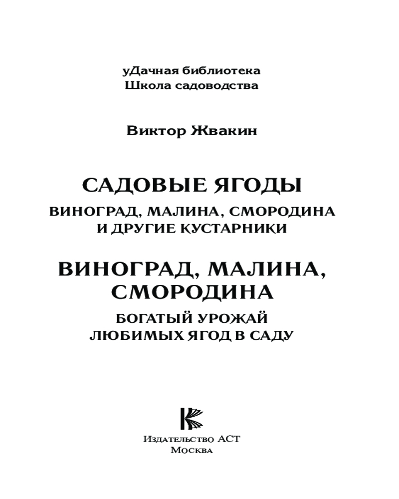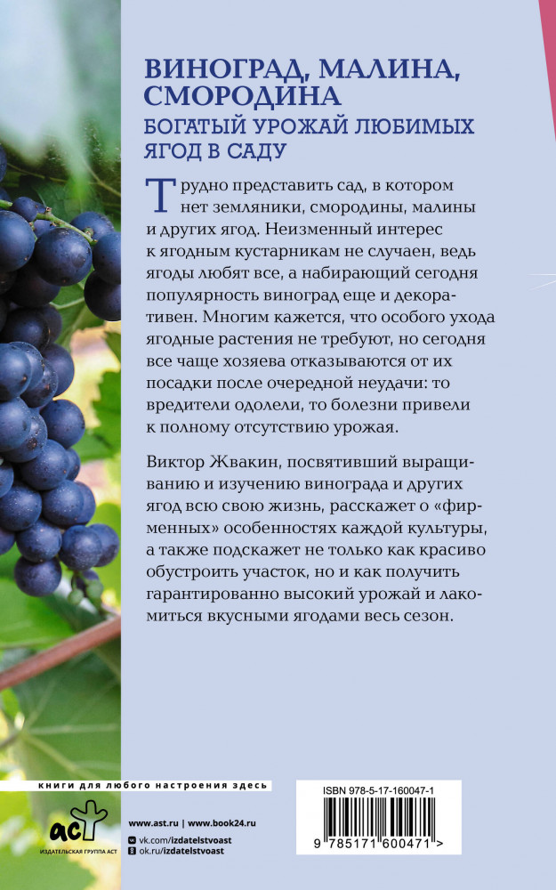 В данный момент этот товар отсутствует в продаже. Возможно, у нас найдется аналогичный или похожий товар здесь. Серия: Школа садоводства Трудно представить сад, в котором нет земляники, смородины, малины и других ягод. Неизменный интерес к ягодным кустарникам не случаен, ведь ягоды любят все, а набирающий сегодня популярность виноград еще и декоративен. Многим кажется, что особого ухода ягодные растения не требуют, но сегодня все чаще хозяева отказываются от их посадки после очередной неудачи: то вредители одолели, то болезни привели к полному отсутствию урожая.