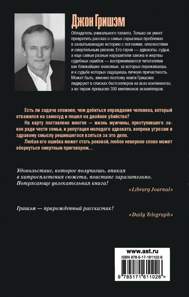 💳 Оплатить за товар можно при получении 🇰🇿 Есть бесплатная доставка по Казахстану от 1 дня 🎁 Копите бонусы с каждой покупки Серия: Эксклюзив: лучшие детективы Есть ли задача сложнее, чем добиться оправдания человека, который отважился на самосуд и пошел на двойное убийство? На карту поставлено многое — жизнь мужчины, преступившего закон ради чести семьи, и репутация молодого адвоката, вопреки угрозам и здравому смыслу решившегося взяться за это дело. Любая его ошибка может стать роковой, любое неверное слово может обернуться смертным приговором... |