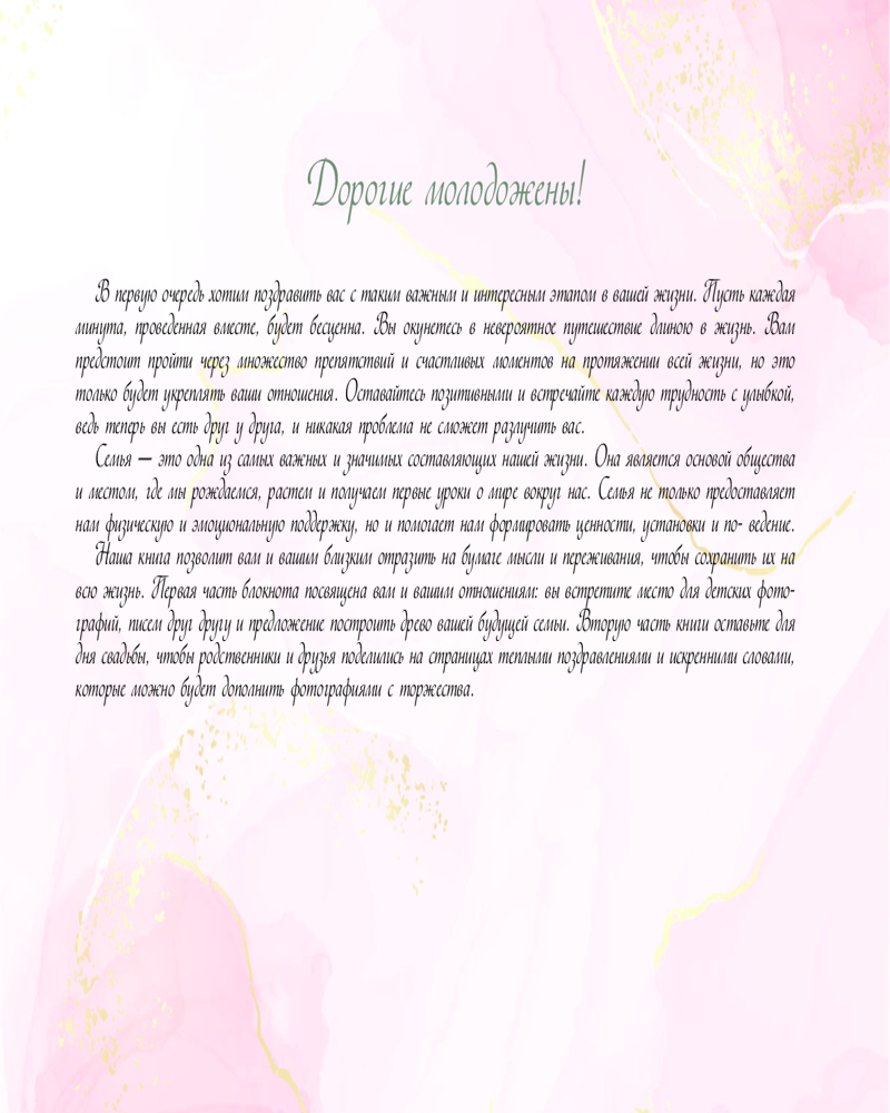 💳 Оплатить за товар можно при получении 🇰🇿 Есть бесплатная доставка по Казахстану от 1 дня 🎁 Копите бонусы с каждой покупки Серия: Блокнот. Подарочная коллекция Уникальная свадебная книга пожеланий — это шанс запечатлеть важное событие красиво и со вкусом. Пройдут годы, а воспоминания сохранятся — вы сможете увидеть ваше семейное древо, прочитать пожелания любимых людей, погрузиться в воспоминания, вместе порадоваться и прочувствовать этот день вновь. |