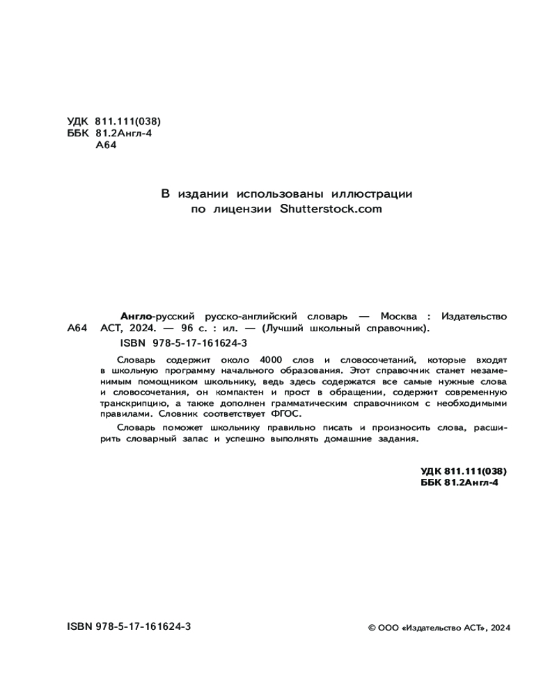 💳 Оплатить за товар можно при получении 🇰🇿 Есть бесплатная доставка по Казахстану от 1 дня 🎁 Копите бонусы с каждой покупки Серия: Лучший школьный справочник Словарь содержит около 4000 слов и словосочетаний, которые входят в школьную программу начального образования. Этот справочник станет незаменимым помощником школьнику, ведь здесь содержатся все самые нужные слова и словосочетания, он компактен и прост в обращении, содержит современную транскрипцию, а также дополнен грамматическим справочником с необходимыми правилами. Словник соответствует ФГОС. Словарь поможет школьнику правильно писать и произносить слова, расширить словарный запас и успешно выполнять домашние задания. |