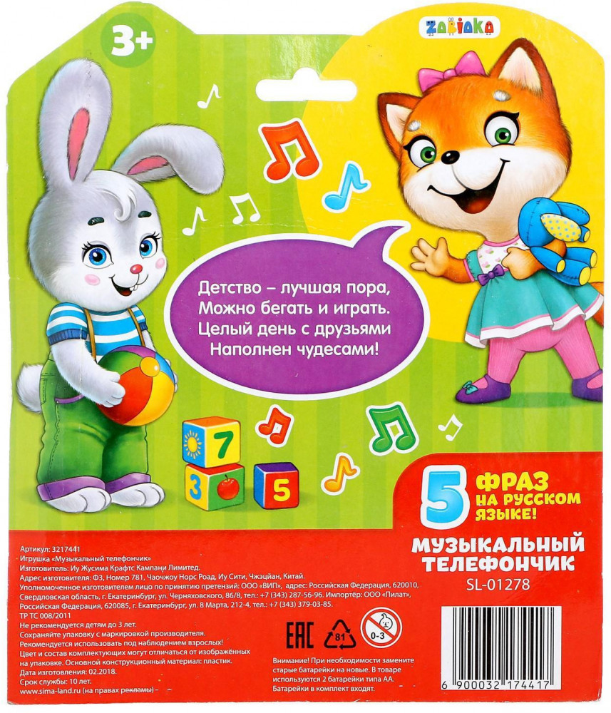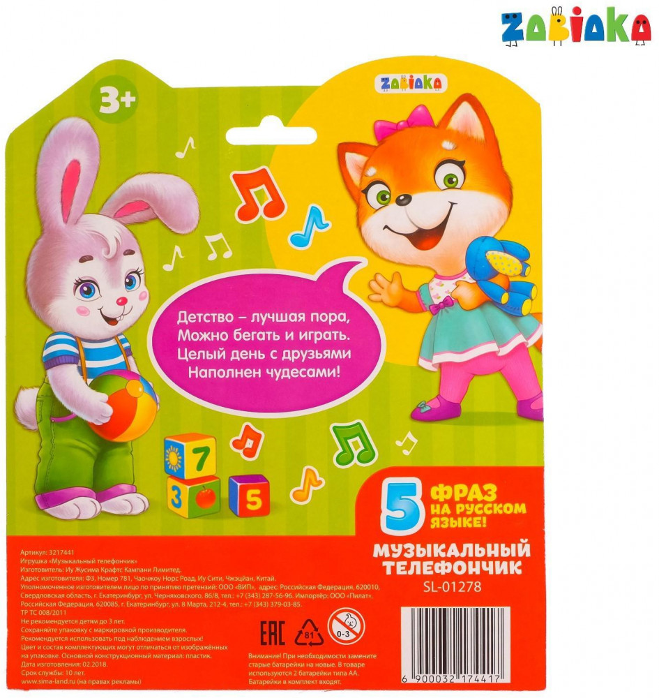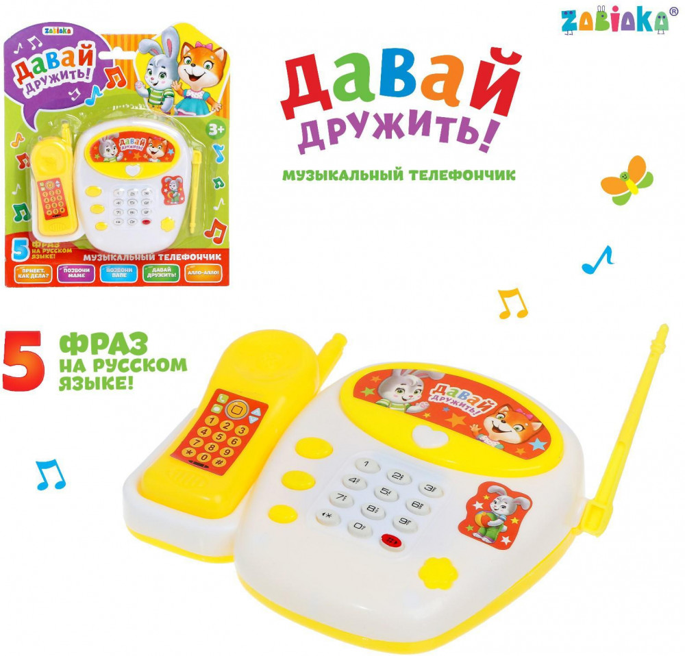 Zabiaka Телефон детский «Давай дружить»В данный момент этот товар отсутствует в продаже. Возможно, у нас найдется аналогичный или похожий товар здесь. Серия: Обучающие музыкальные телефончики Телефон создан для сюжетных игр. Он помогает развивать моторику и слух у деток. Дизайн игрушки не оставит малышей равнодушными, ведь он выполнен с картинками милых зверят. Клавиши на аппарате познакомят ребёнка с цифрами и помогут обучить его счёту до 9. С этой игрушкой малыш сможет проигрывать различные ситуации из жизни и фантазировать. Например, представлять, как он звонит маме, папе или бабушке. Телефончик воспроизводит 1 весёлую мелодию. У него мерцает огонёк. |