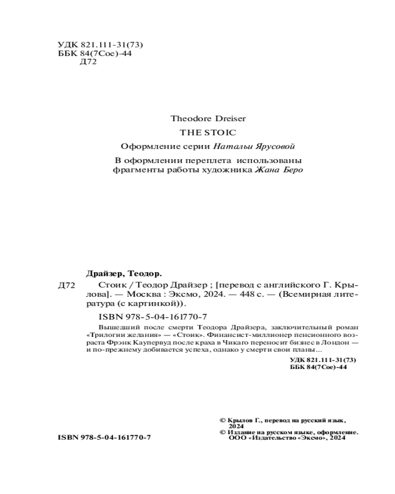 💳 Оплатить за товар можно при получении 🇰🇿 Есть бесплатная доставка по Казахстану от 1 дня 🎁 Копите бонусы с каждой покупки Серия: Всемирная литература (новое оформление) «Стоик» — третья, заключительная часть «трилогии желания» Теодора Драйзера, в основу которой положена история жизни американского миллионера Ч. Йеркса, сыгравшего значительную роль в разработке системы общественного транспорта в Чикаго и Лондонского метрополитена. Главный герой — Фрэнк Каупервуд — переносит деятельность в Лондон, решив заняться строительством линий метрополитена. Герой, как и прежде, бросается из одной схватки в другую, преодолевает серьезные препятствия, до конца жизни оставаясь на вершине финансового олимпа. |