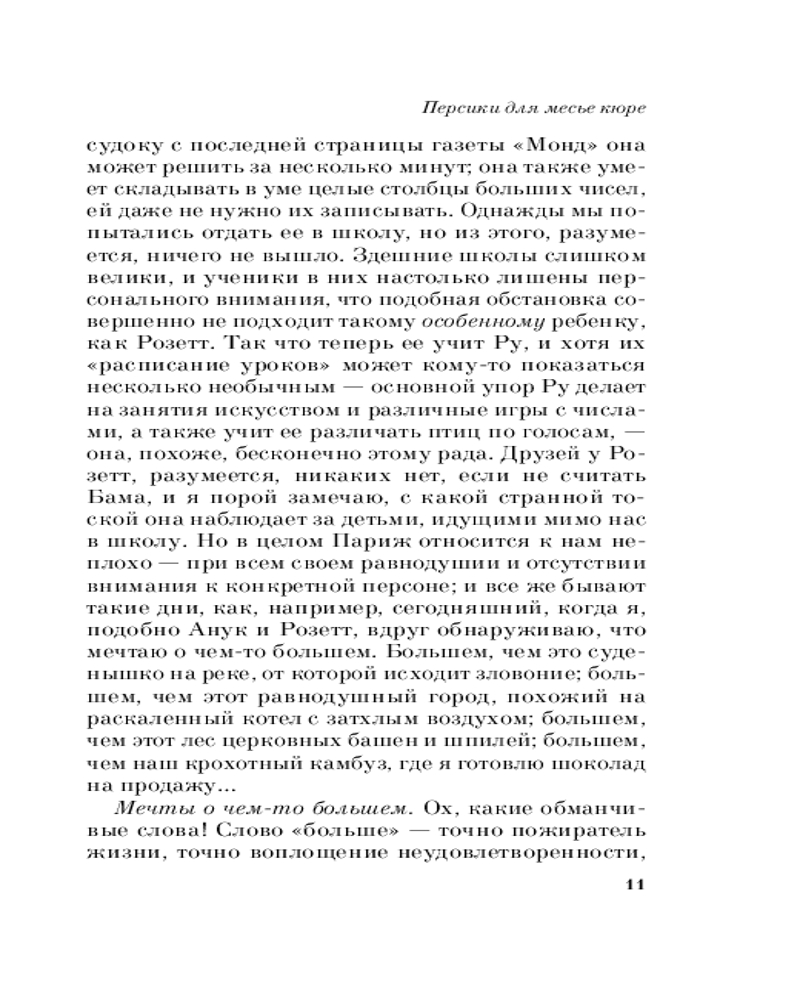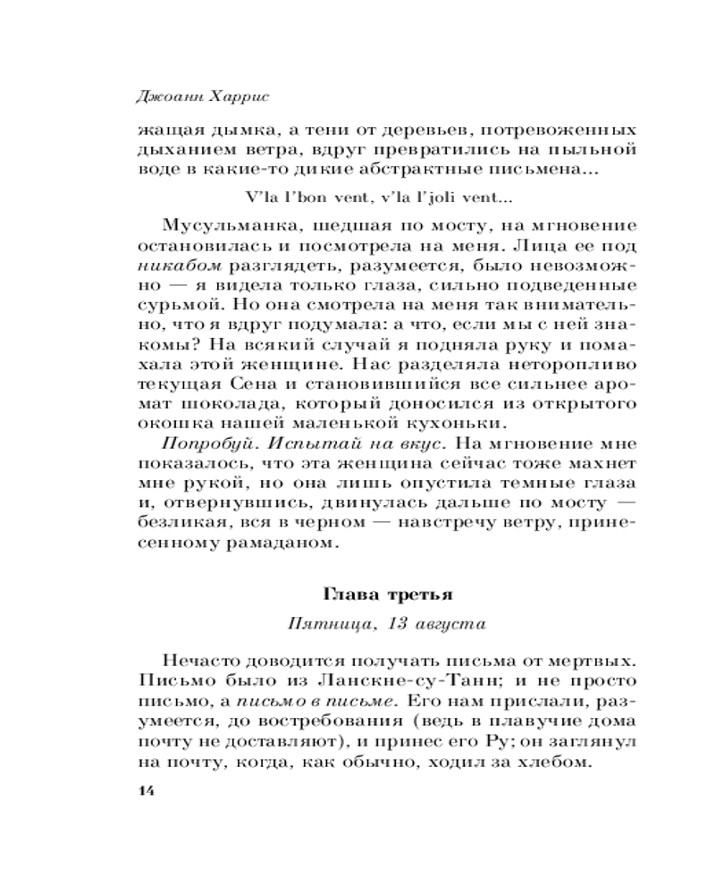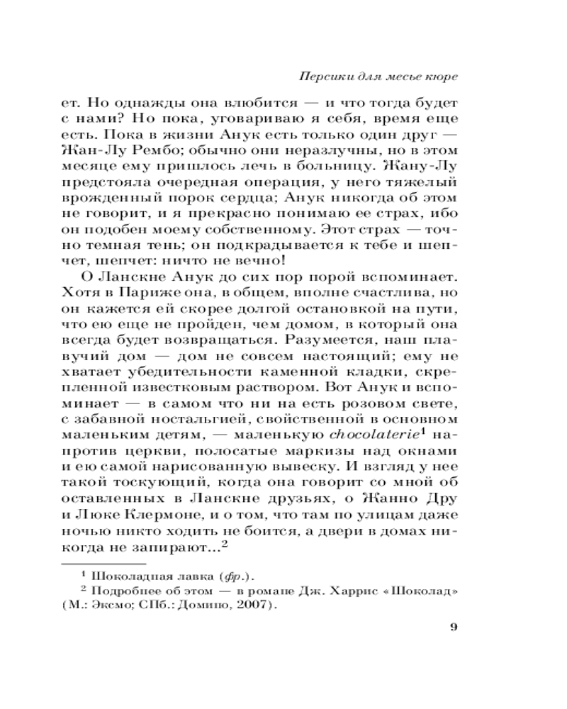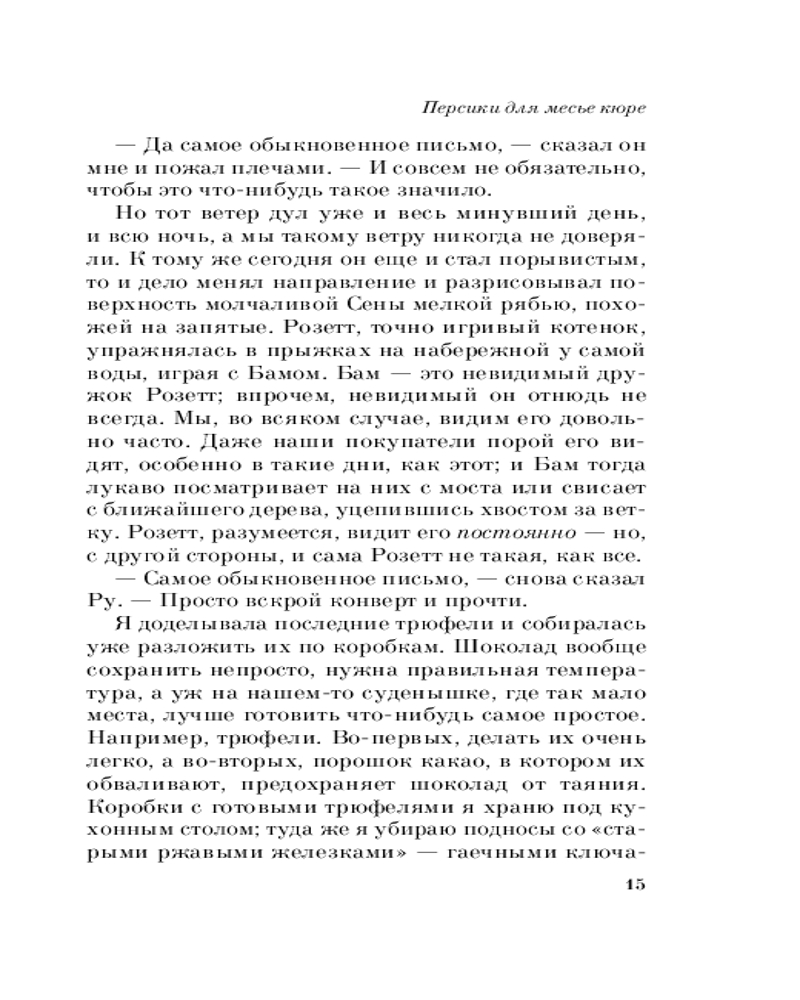 Весь цикл «шоколадной тетралогии» состоит из романов, читать которые надо в следующей последовательности: «Шоколад», «Леденцовые туфельки», «Персики для месье кюре» и «Земляничный вор». Прекрасное средство от хандры! |