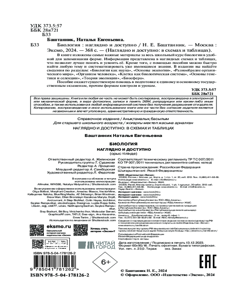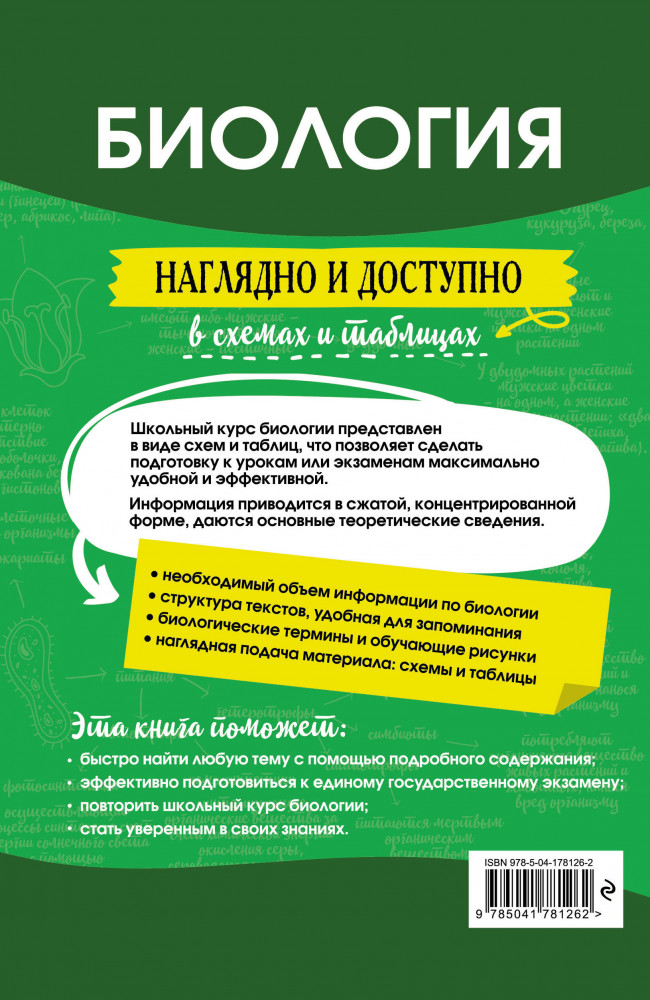 💳 Оплатить за товар можно при получении 🇰🇿 Есть бесплатная доставка по Казахстану от 1 дня 🎁 Копите бонусы с каждой покупки Серия: Наглядно и доступно: в схемах и таблицах Школьный курс биологии за 5–11 классы собран в одной книге в удобной для запоминания форме. Информация представлена в наглядных схемах и таблицах, что позволит лучше понять и усвоить её. Кроме того, с помощью пособия можно быстро найти любую тему и систематизировать уже имеющиеся знания. В издании вы найдёте сведения по разделам: «Биология как наука», «Основы экологии», «Разнообразие органического мира», «Организм человека», «Клетка как биологическая система», «Основы генетики и селекции», «Теория эволюции», «Биосфера». Пособие окажет существенную помощь в подготовке к ЕГЭ, прочим формам контроля и урокам. Также оно может быть полезно учителям при планировании и проведении занятий. |