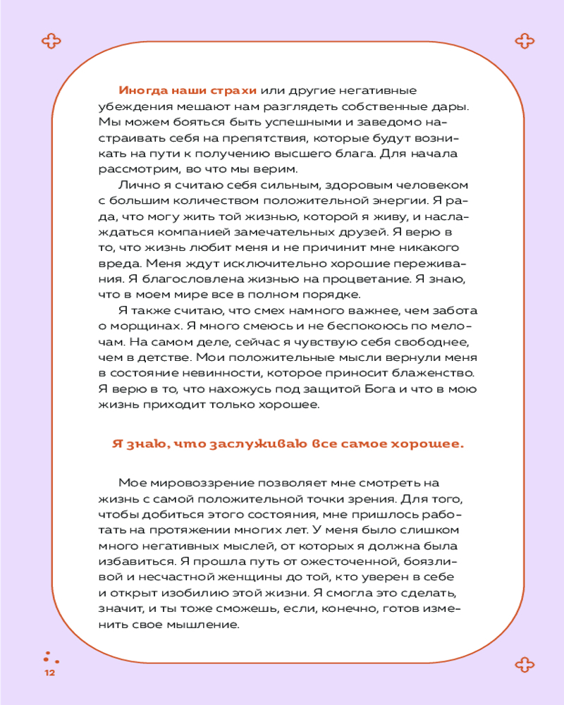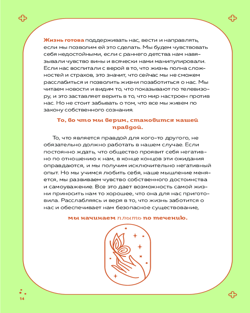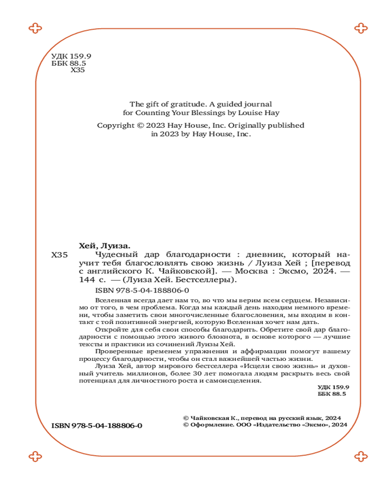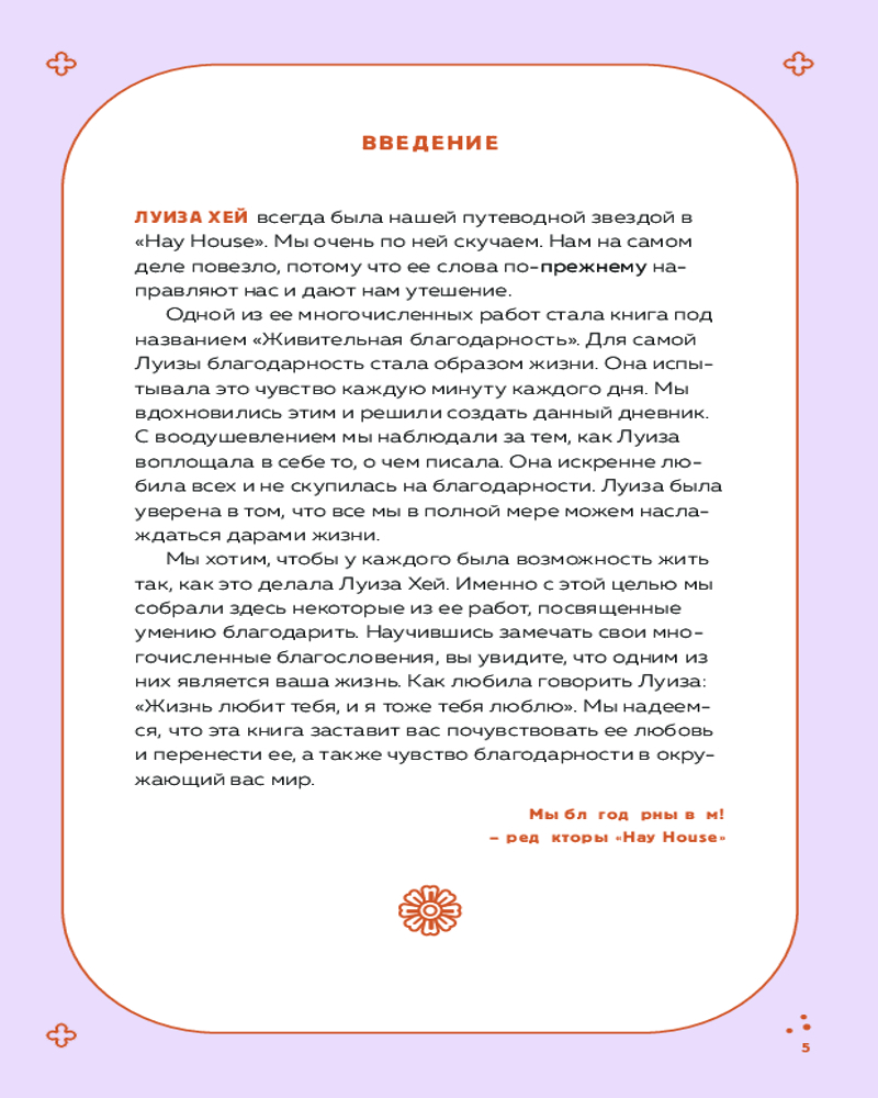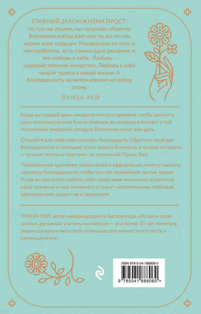 💳 Оплатить за товар можно при получении 🇰🇿 Есть бесплатная доставка по Казахстану от 1 дня 🎁 Копите бонусы с каждой покупки Серия: Луиза Хей. Бестселлеры Вселенная всегда дает нам то, во что мы верим всем сердцем. Независимо от того, в чем наша проблема. Откройте для себя свои способы благодарить. Обретите свой дар благодарности с помощью этого живого блокнота, в основе которого — лучшие тексты и практики из сочинений Луизы Хей. Проверенные временем упражнения и аффирмации помогут процессу благодарности, чтобы он стал важнейшей частью жизни. Луиза Хей, автор мирового бестселлера «Исцели свою жизнь» и духовный учитель миллионов, более 30 лет помогала людям раскрыть весь свой потенциал для личностного роста и самоисцеления. Следуйте ее мудрым советам и практикам, и ваша жизнь изменится к лучшему. |