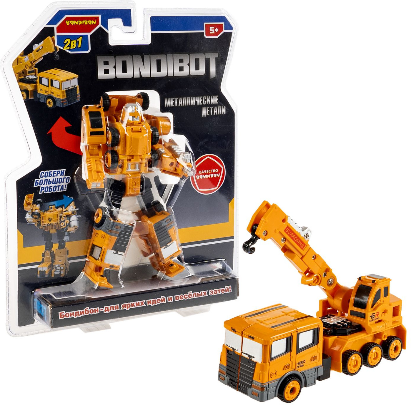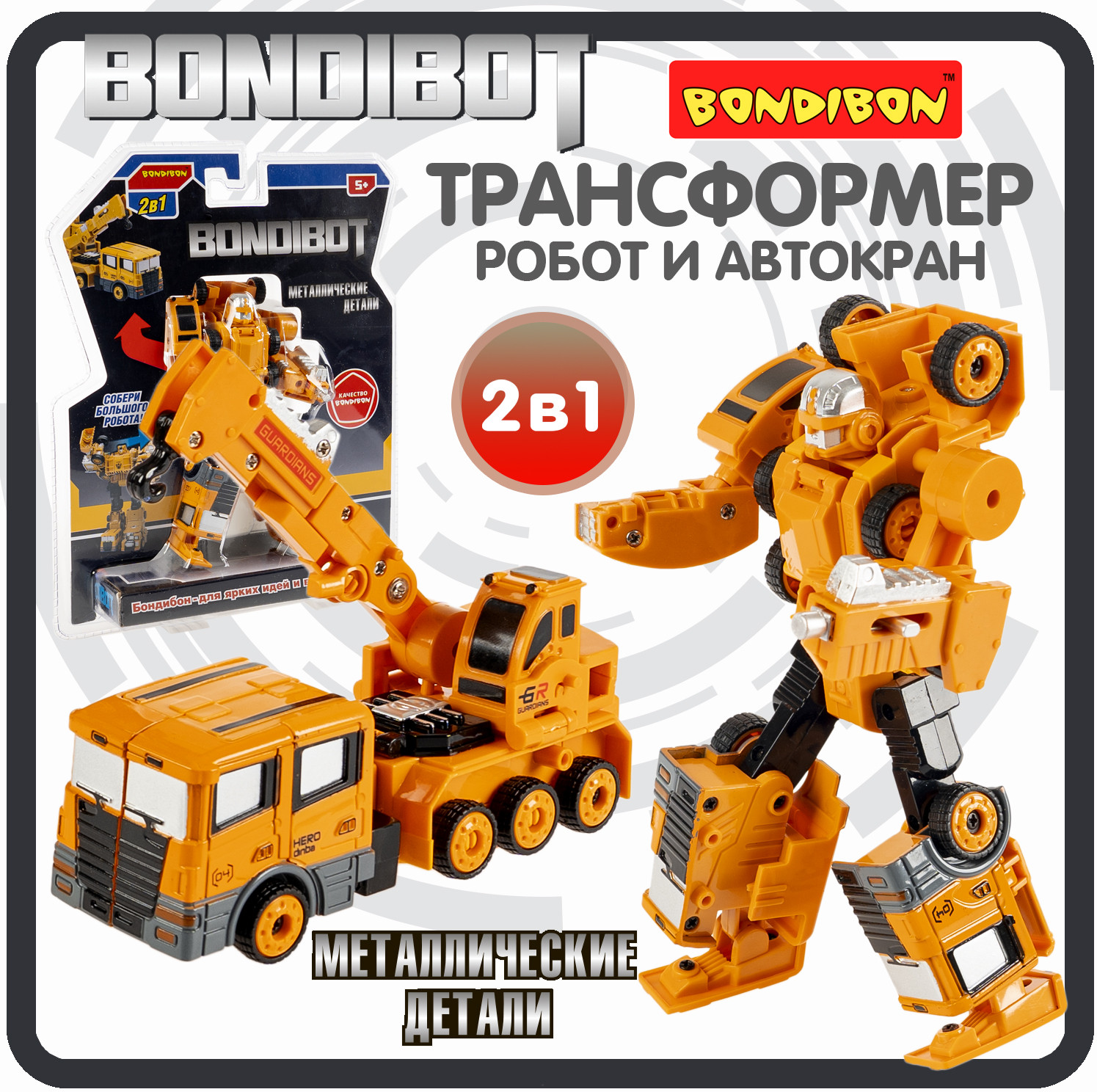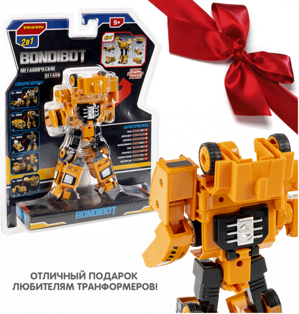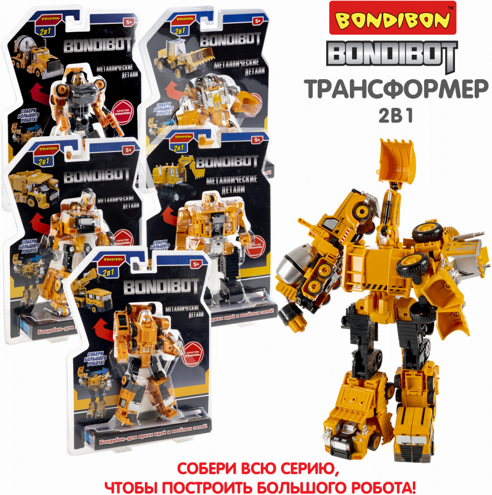 Желтый трансформер «Робот-автокран» 2 в 1 серии Bondibon от Bondibon непременно порадует маленьких любителей строительной техники. Две интересные игрушки в одной с металлическими деталями надолго увлекут ребенка. Соберите всю серию и сделайте большого робота 5 в 1!