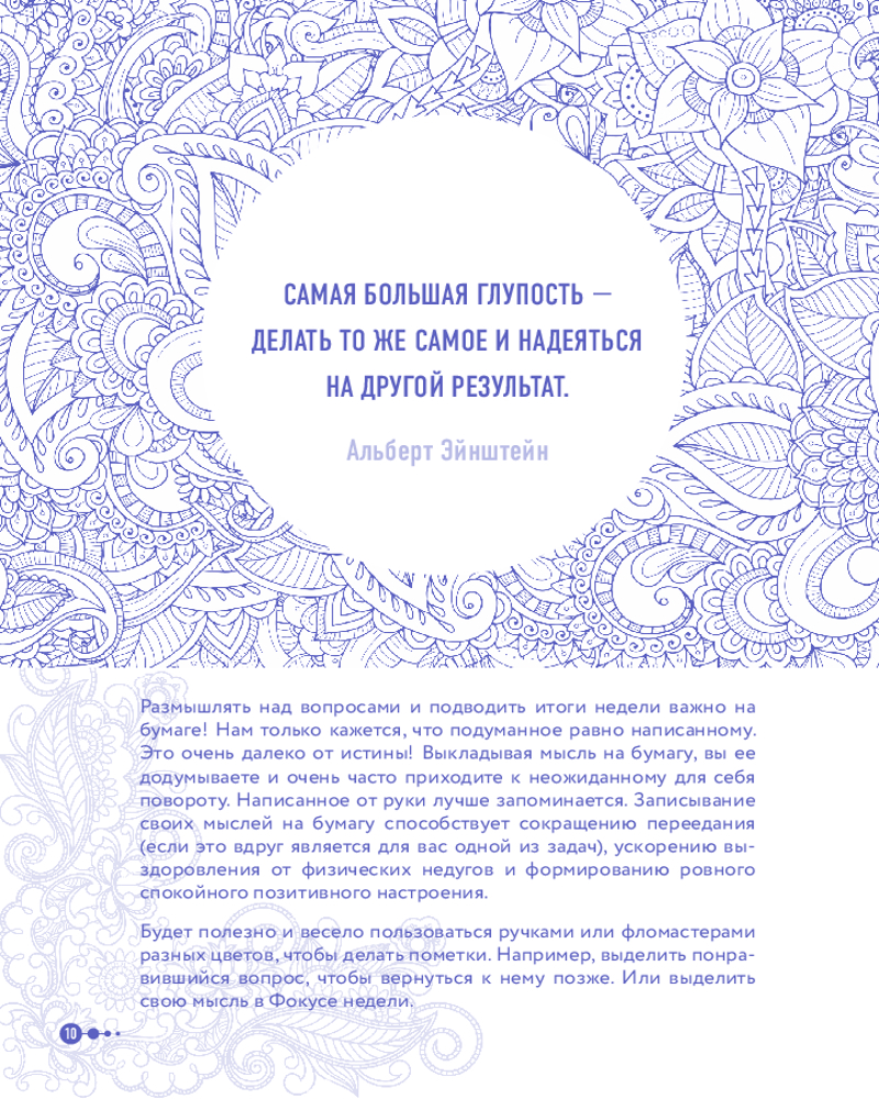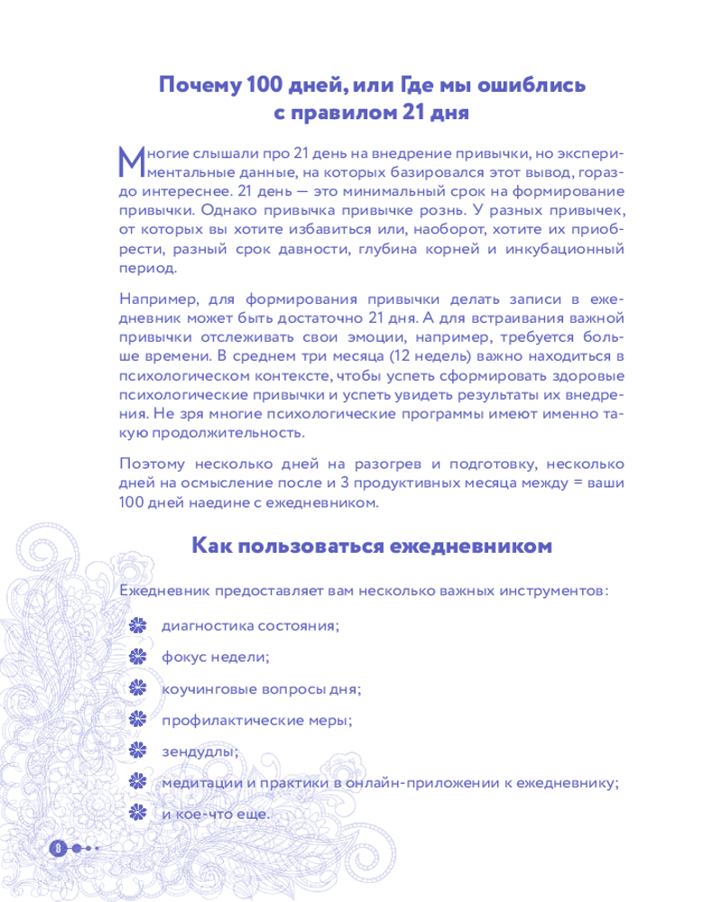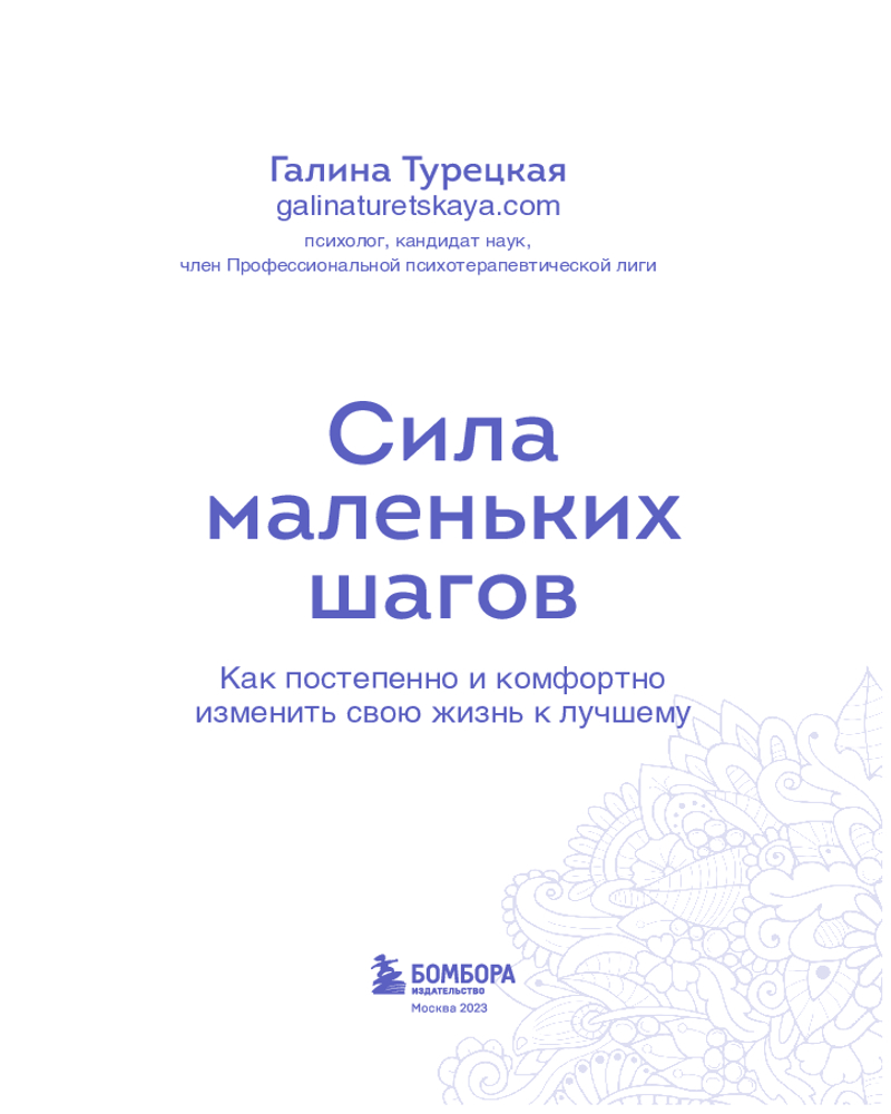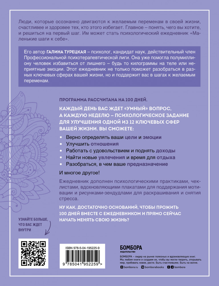 Именно таким шагом и может стать психологический ежедневник Маленькие шаги к себе". Его автор Галина Турецкая — психолог, кандидат наук, член Профессиональной психотерапевтической лиги. Свою миссию она нашла в том, чтобы помогать людям избавляться от лишнего. Будь то килограммы на теле или неприятные эмоции. Этот ежедневник не только будет направлять вас по пути саморефлексии, но и поддержит вас в шагах к желаемым переменам. Программа рассчитана на 100 дней и состоит из 12 недельных блоков. Каждую неделю вы будете прорабатывать один из самых важных аспектов вашей жизни.