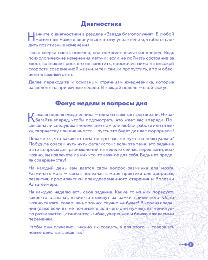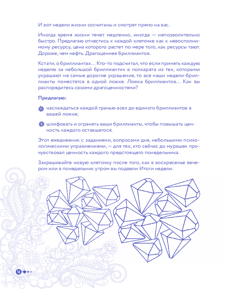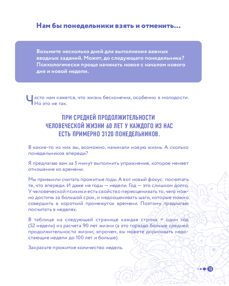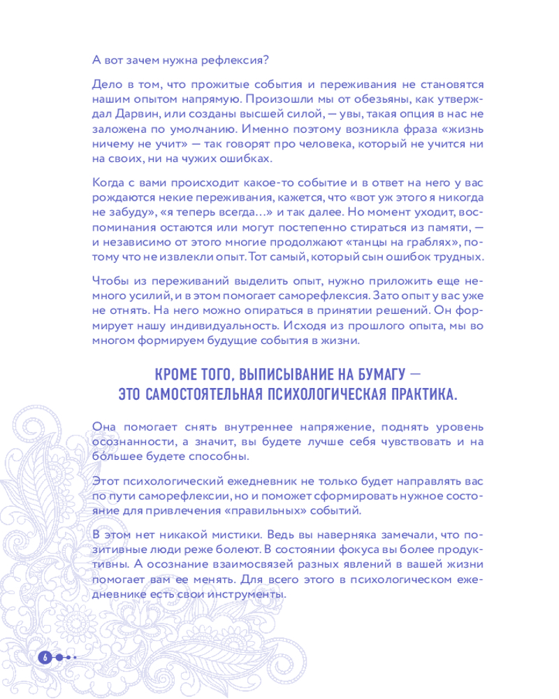 Именно таким шагом и может стать психологический ежедневник Маленькие шаги к себе". Его автор Галина Турецкая — психолог, кандидат наук, член Профессиональной психотерапевтической лиги. Свою миссию она нашла в том, чтобы помогать людям избавляться от лишнего. Будь то килограммы на теле или неприятные эмоции. Этот ежедневник не только будет направлять вас по пути саморефлексии, но и поддержит вас в шагах к желаемым переменам. Программа рассчитана на 100 дней и состоит из 12 недельных блоков. Каждую неделю вы будете прорабатывать один из самых важных аспектов вашей жизни.