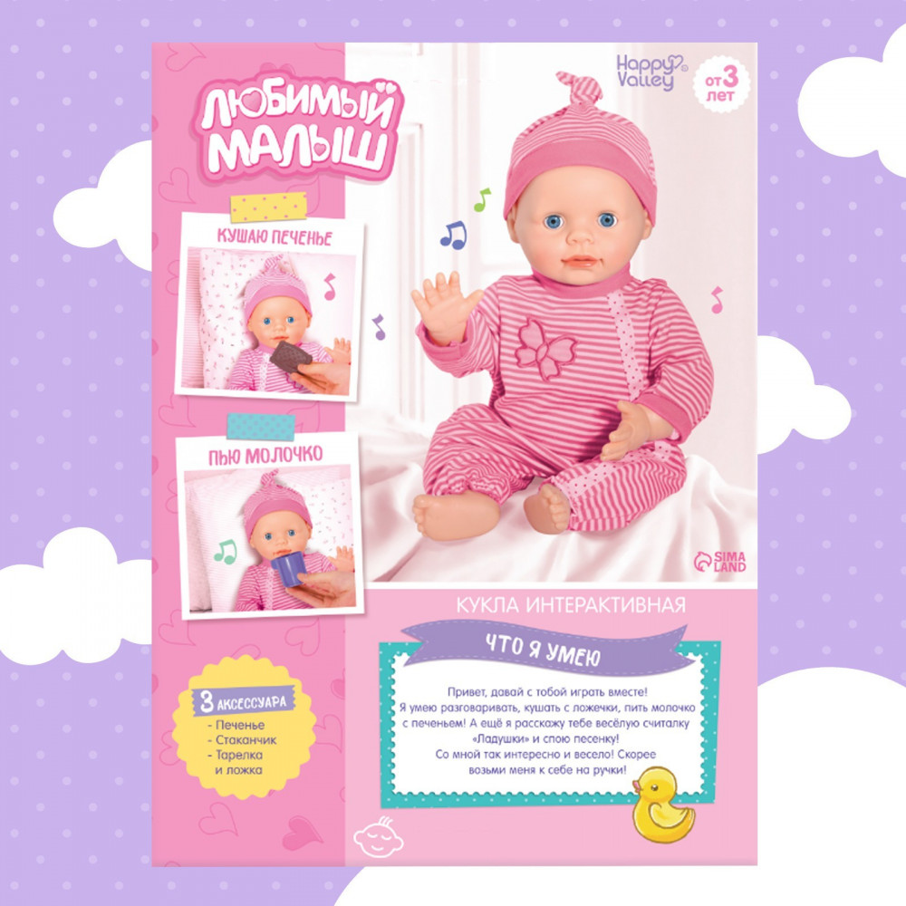 Happy Valley Пупс интерактивный «Малыш»В данный момент этот товар отсутствует в продаже. Возможно, у нас найдется аналогичный или похожий товар здесь. Серия: Музыкальные куклы Ваша принцесса любит играть в дочки-матери? Тогда от этого набора с пупсом и аксессуарами она будет в восторге! «Малыш» — это не только кукла, за которой нужно ухаживать, но и прекрасный компаньон для больших воображаемых и реальных приключений. Играть в куклы — полезно. Взаимодействуя с куклами, девочка развивает креативность и эстетический вкус, а также тренирует сообразительность, фантазию и мелкую моторику. Ребёнок осваивает социальные роли, проецирует модели поведения взрослых на игровые сюжеты, учится заботе и ответственности. |