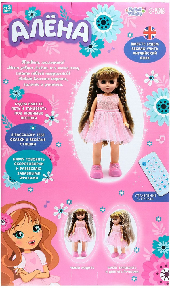 Happy Valley Кукла интерактивная «Алёна»В данный момент этот товар отсутствует в продаже. Возможно, у нас найдется аналогичный или похожий товар здесь. Серия: Музыкальные куклы Интерактивная кукла «Алёна» — это увлекательная игрушка для детей от 3 лет. С ней ваш малыш проведёт время весело и с пользой. Кукла умеет говорить, петь, танцевать, рассказывать сказки и стихи, а также обучает английскому языку. Интерактивная кукла станет эффектным подарком на любой праздник. Играть в куклы — полезно. Взаимодействуя с такими игрушками, девочка осваивает социальные роли, тренирует фантазию и внимательность. Кукла говорит на русском языке. |