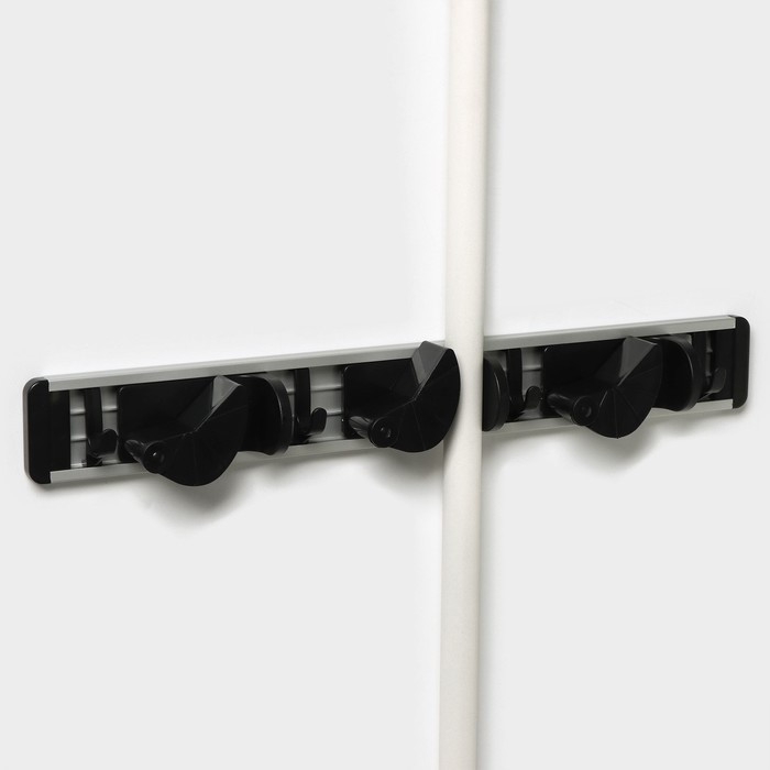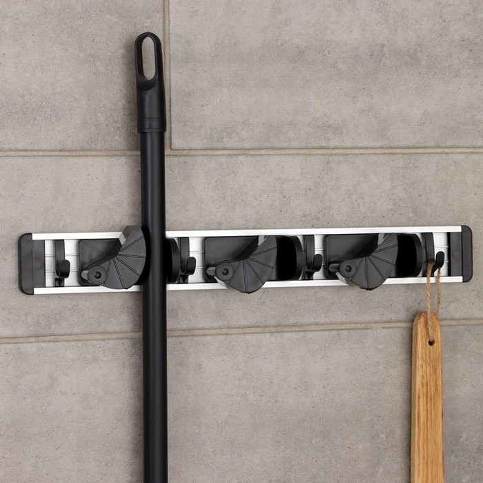 Удобный и практичный аксессуар, который поможет навести порядок в вашей ванной комнате, прихожей или туалете — держатель швабр, щёток и других бытовых изделий. |
