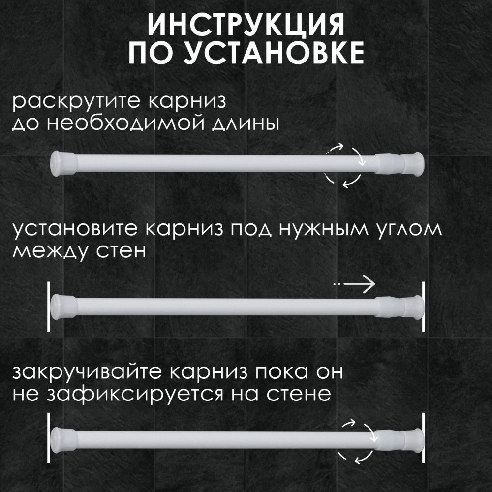 💳 Оплатить за товар можно при получении 🇰🇿 Есть бесплатная доставка по Казахстану от 1 дня 🎁 Копите бонусы с каждой покупки Металлический карниз работает по следующему принципу. Вы устанавливаете его одной стороной в стену и раскручиваете с другой. Так он увеличивается до 120 см. После того как второй край упрётся, следует сделать ещё 2–3 оборота для более надёжной фиксации. Затем просто навесьте штору с крючками и распрямите её по всей длине. |