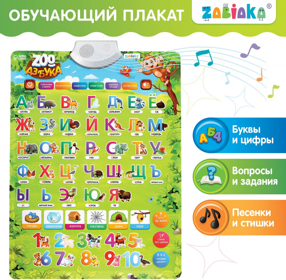 В данный момент этот товар отсутствует в продаже. Возможно, у нас найдется аналогичный или похожий товар здесь. Серия: Обучающие и развивающие плакаты Обучающий плакат «ZOO-Азбука» поможет вовлечь ребёнка в учебный процесс, потренировать внимание, логическое мышление и память. Яркие картинки сделают процесс обучения веселее и надолго займут ребёнка, а большое разнообразие режимов позволит вашему малышу быстро освоить материал.