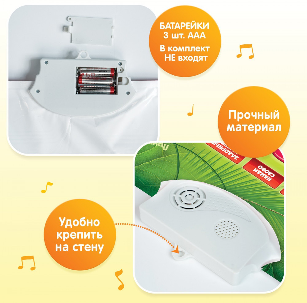 С такой игрушкой малыш в лёгкой игровой форме познакомится с разными животными, выучит алфавит, счёт до 10 и основные цвета. Для закрепления полученных знаний есть интересные вопросы, на которые малышу предстоит ответить. Игрушка воспроизводит 4 песенки про обезьянку, нажав на цифру - звук животного который нарисован на цифре, затем стих про цифру. На плакате есть кнопка регулировки громкости и вкл/выкл. |