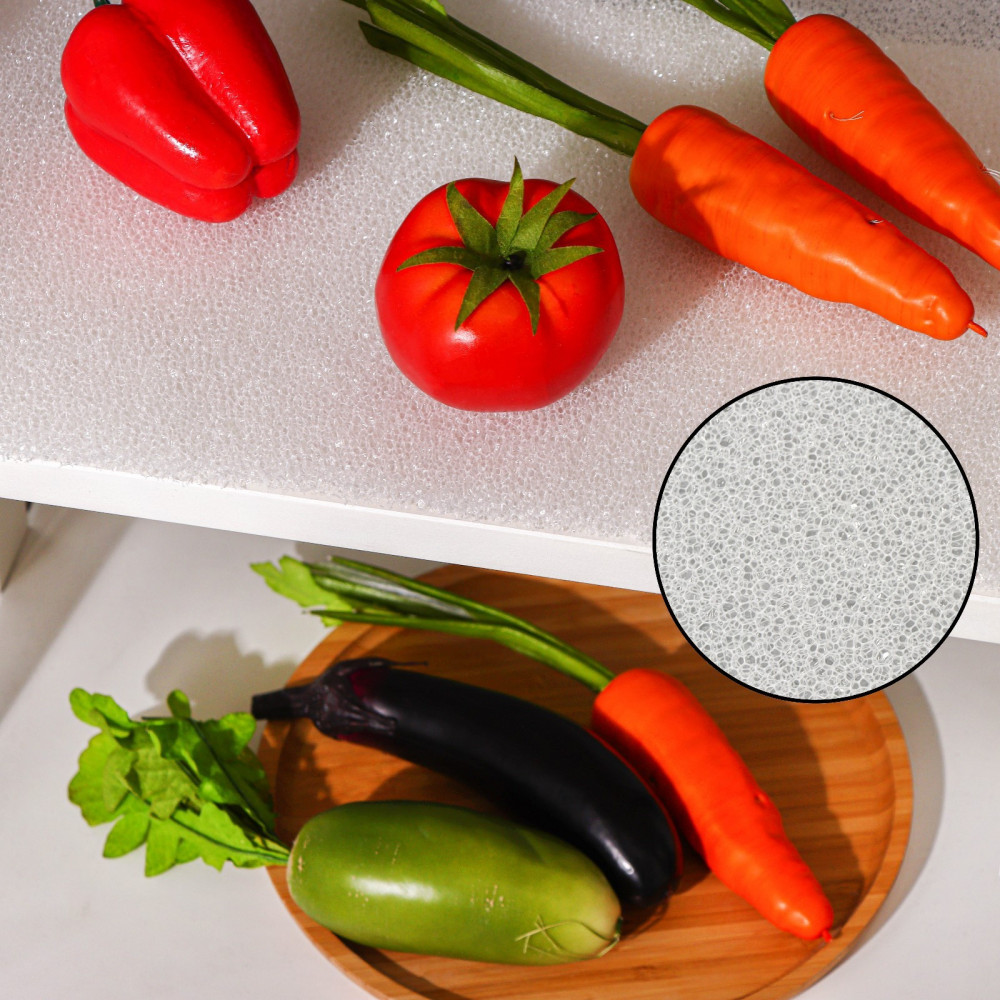 Коврик используется для хранения овощей и фруктов. Он обеспечит свежесть продуктов в течение длительного времени благодаря циркуляции воздуха между ними и поверхностями холодильника. Изготовлен из поролона, за ним легко ухаживать, можно мыть под тёплой водой с использованием жидких моющих средств.