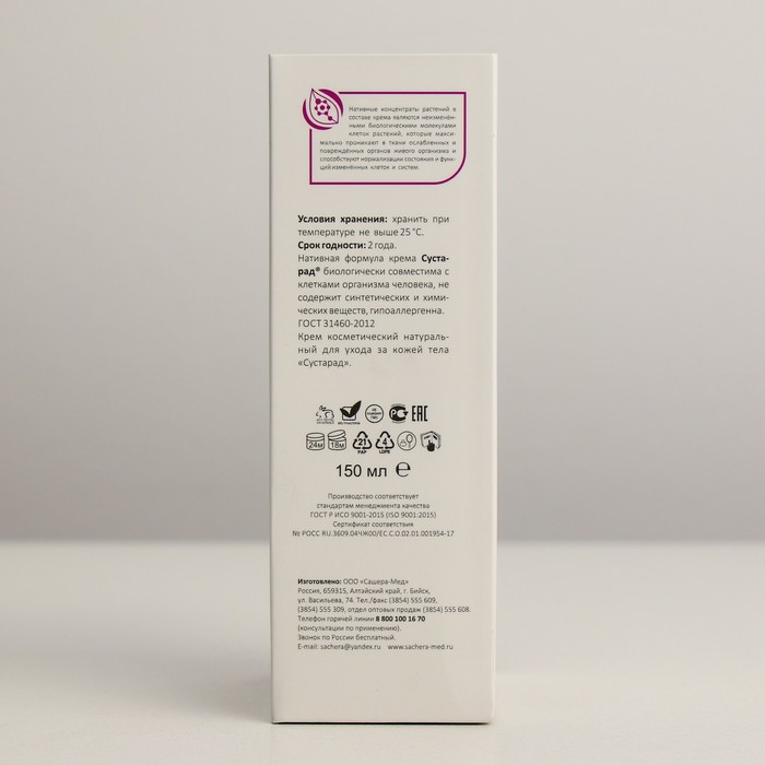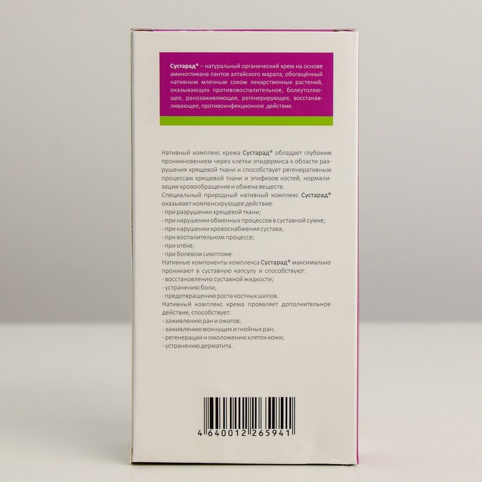 Сашера-Мед Крем для суставов «Сустарад»В данный момент этот товар отсутствует в продаже. Возможно, у нас найдется аналогичный или похожий товар здесь. Сустарад® — натуральный органический крем на основе аминогликана пантов алтайского марала, обогащённый нативным млечным соком лекарственных растений, оказывающих противовоспалительное, болеутоляющее, ранозаживляющее, регенерирующее, восстанавливающее, противоинфекционное действие. |