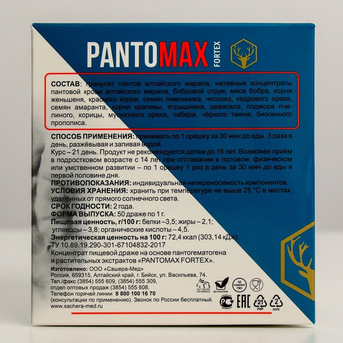Сашера-Мед Комплекс биогенный для мужчин «Pantomax fortex»В данный момент этот товар отсутствует в продаже. Возможно, у нас найдется аналогичный или похожий товар здесь. PantoMax Fortex — биогенный продукт на основе гранулята пантов алтайского марала, обогащённый микросферами концентратов активных структур растений и природных компонентов, направленный на регуляцию функций и состояния органов мочеполовой, эндокринной, нервной системы мужчин, нормализацию эректильной функции, восстановление биохимического равновесия синтеза гормонов и функций органов репродуктивной системы. |