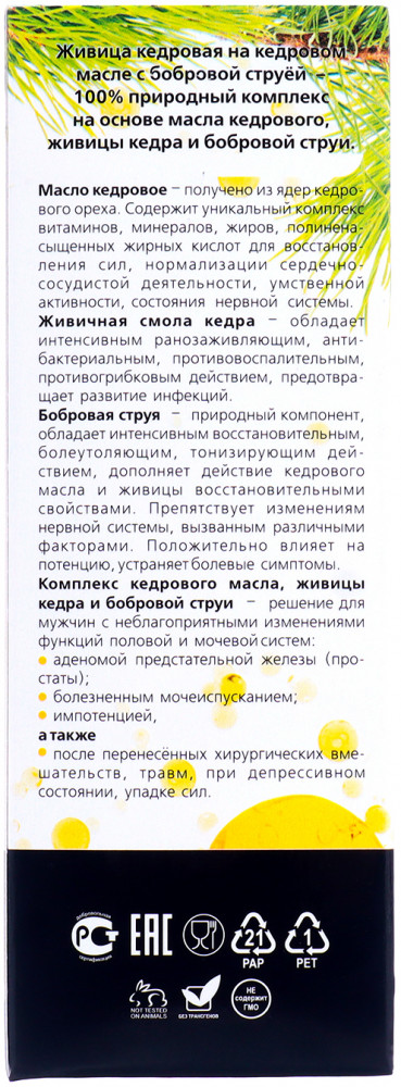 • бобровая струя — природный компонент, обладает интенсивным восстановительным, болеутоляющим, тонизирующим действием, дополняет действие кедрового масла и живицы восстановительными свойствами. Препятствует изменениям нервной системы, вызванным различными факторами. Положительно влияет на потенцию, устраняет болевые симптомы.