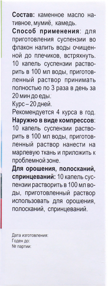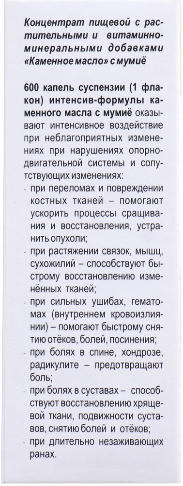Нативный комплекс каменного масла и мумиё эффективен при приёме внутрь и наружно, оказывает противовоспалительное, ранозаживляющее, антибактериальное действие на молекулярном уровне, что обусловливает его быстрое и эффективное воздействие на нарушения и сопутствующие изменения.