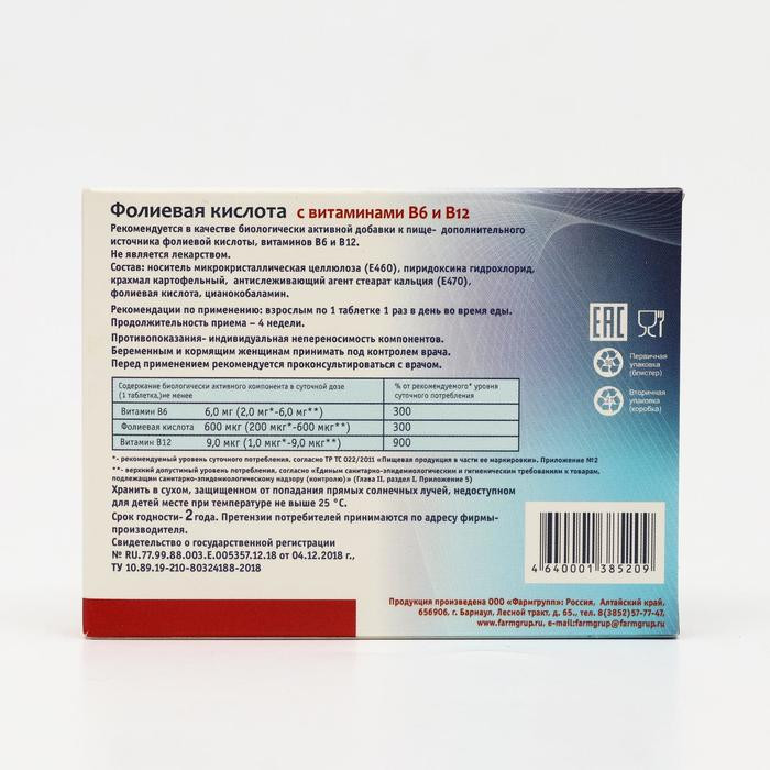 Фармгрупп Фолиевая кислота с витаминами B6 и B12-35% +21 доступная цена хорошая упаковка витаминный комплекс