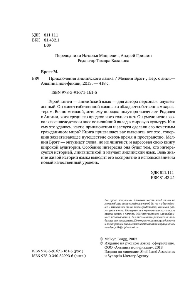Приключения английского языкаВ данный момент этот товар отсутствует в продаже. Возможно, у нас найдется аналогичный или похожий товар здесь. «С самого начала его окружали соперники, опасности и угрозы: он избежал вымирания и пережил попытку удушения; он отважно противостоял грабежу, использовал и упускал возможности; вел и ведет счет достижениям и потерям. Ожесточенные битвы за слова решали, какому наречию победить. Но все же английский язык обладал и обладает величайшими сокровищами: шедеврами литературы, устойчивым строем, и в наши дни обеспечивающими всему миру возможность общаться» |