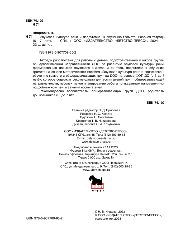 Тетрадь разработана для работы с детьми подготовительной к школе группы общеразвивающей направленности ДОО по развитию звуковой культуры речи, формированию навыков звукового анализа и синтеза, подготовке к обучению грамоте на основе методического пособия «Звуковая культура речи и подготовка к обучению грамоте в общеразвивающих группах ДОО на основе ФОП ДО (с 3 до 7 лет)», которое содержит рекомендации для воспитателей групп общеразвивающей направленности, перспективное планирование работы по указанным направлениям, подробные конспекты занятий воспитателей. Рекомендовано воспитателям общеразвивающих групп ДОО, родителям дошкольников с 6 до 7 лет. |