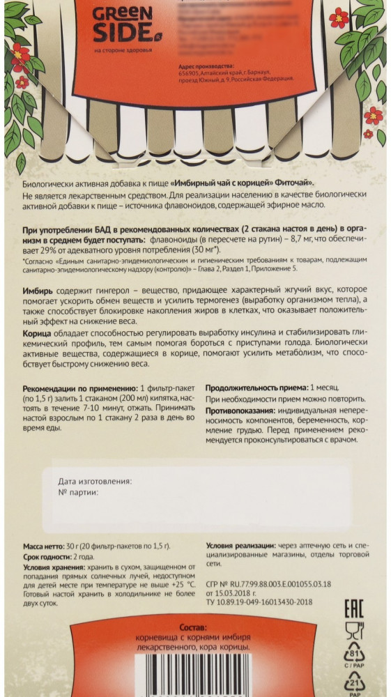 Грин Сайд Чай имбирный с корицейВ данный момент этот товар отсутствует в продаже. Возможно, у нас найдется аналогичный или похожий товар здесь. Имбирный чай с корицей восполняет баланс полезных веществ в организме, способствует снижению веса — регулирует выработку инсулина и стабилизирует гликемический профиль, тем самым помогая бороться с приступами голода. Чай с имбирём и корицей выводит шлаки и токсины из организма. Напиток обладает тонизирующим, иммуностимулирующим и антиоксидантным действием. |