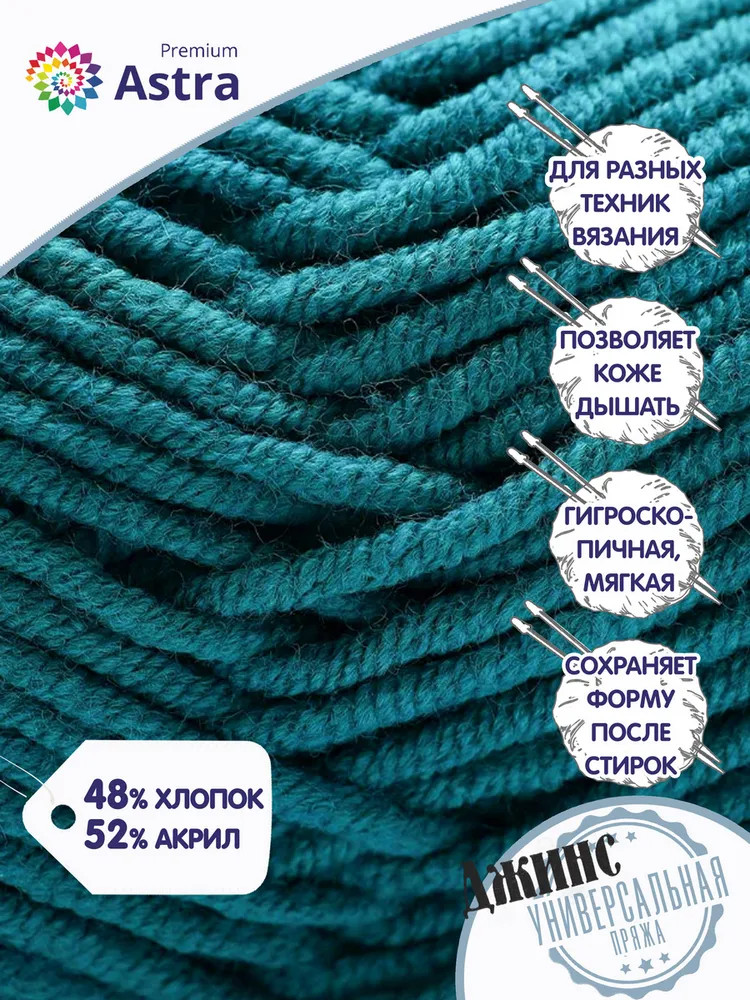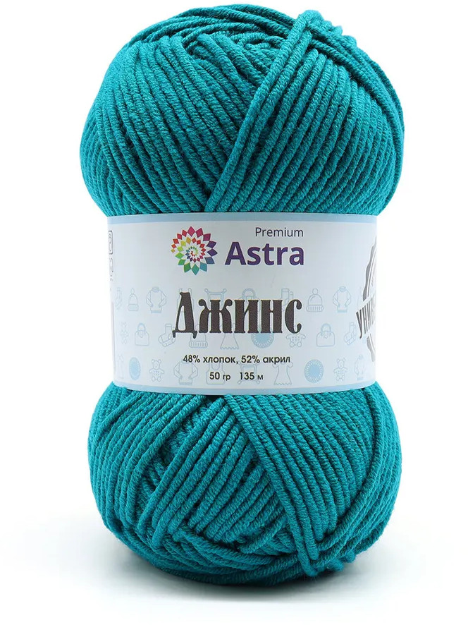 «Джинс» от Astra Premium — удачный выбор для создания практичных вещей в повседневном стиле. Пряжа универсальная, подходит для вязания шапочек, носков, свитеров, мягких игрушек. Продается небольшими мотками по 50 г. Чтобы связать свитер для взрослого, понадобится около 450 г пряжи, или 9 мотков.