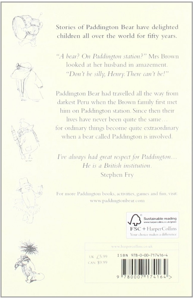 A Bear Called PaddingtonВ данный момент этот товар отсутствует в продаже. Возможно, у нас найдется аналогичный или похожий товар здесь. Mr. and Mrs. Brown first met Paddington, a most endearing bear from Darkest Peru on a railway platform in London. A sign hanging around his neck said, «Please look after this bear. Thank you» So that is just what they did. From the very first night when he attempted his first bath and ended up nearly flooding the house, Paddington was seldom far from imminent disaster. Jonathan and Judy were delighted with this havoc and even Mr. and Mrs. Brown had to admit that life seemed to be more filled with adventure when there was a bear in the house. |