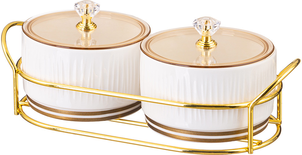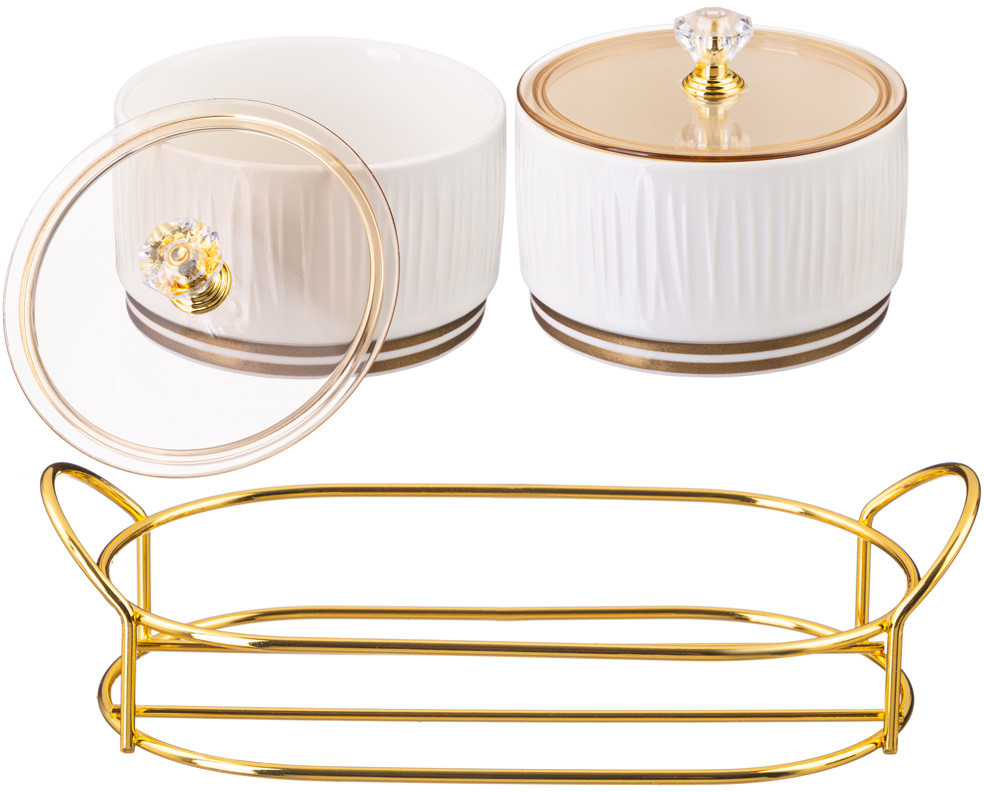 Набор банок для сыпучих продуктов с пластиковой крышкой на металлической подставке «Herbal» ТМ Lefard — это настоящая находка для хозяйки. Удивить гостей и домашних совсем непросто и поэтому дизайнеры торговой марки обращают внимание на способы подачи блюд и организацию чаепитий. Мармиты прямоугольные и овальные, менажницы круглые и прямоугольные на 4 и 5 секций с пластиковыми крышками и без, креманки, салатники разных размеров, банки, чайники с металлическими ситами, чайные пары и кружки помогут в этом. Изделия выполнены из упрочненного фарфора с отделкой близкой по цвету золотой. Красивый рельеф напоминает стебли сочных трав и создает игру света благодаря блестящей глянцевой поверхности. Это хороший подарок. Стильная цветная упаковка. Посуда прошла сертификацию. Безопасна для контакта с пищевыми продуктами. Изделия не рекомендуется использовать в микроволновой печи, мыть в посудомоечной машине.
