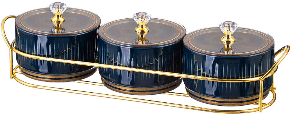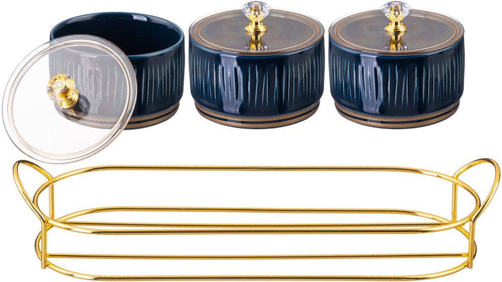 Набор банок для сыпучих продуктов с пластиковой крышкой на металлической подставке «Herbal» ТМ Lefard — это настоящая находка для хозяйки. Удивить гостей и домашних совсем непросто и поэтому дизайнеры торговой марки обращают внимание на способы подачи блюд и организацию чаепитий. Мармиты прямоугольные и овальные, менажницы круглые и прямоугольные на 4 и 5 секций с пластиковыми крышками и без, креманки, салатники разных размеров, банки, чайники с металлическими ситами, чайные пары и кружки помогут в этом. Изделия выполнены из упрочненного фарфора с отделкой близкой по цвету золотой. Красивый рельеф напоминает стебли сочных трав и создает игру света благодаря блестящей глянцевой поверхности. Это хороший подарок. Стильная цветная упаковка. Посуда прошла сертификацию. Безопасна для контакта с пищевыми продуктами. Изделия не рекомендуется использовать в микроволновой печи, мыть в посудомоечной машине.